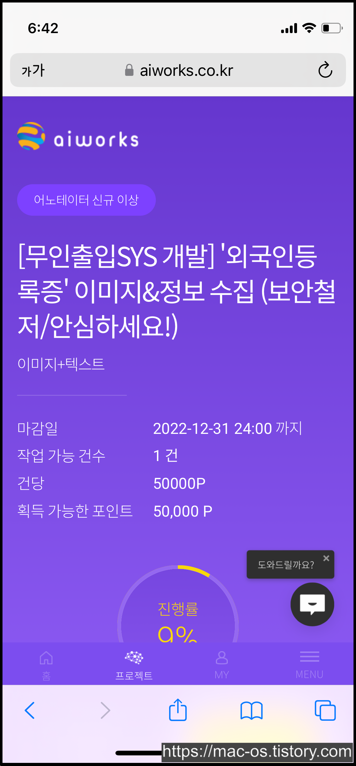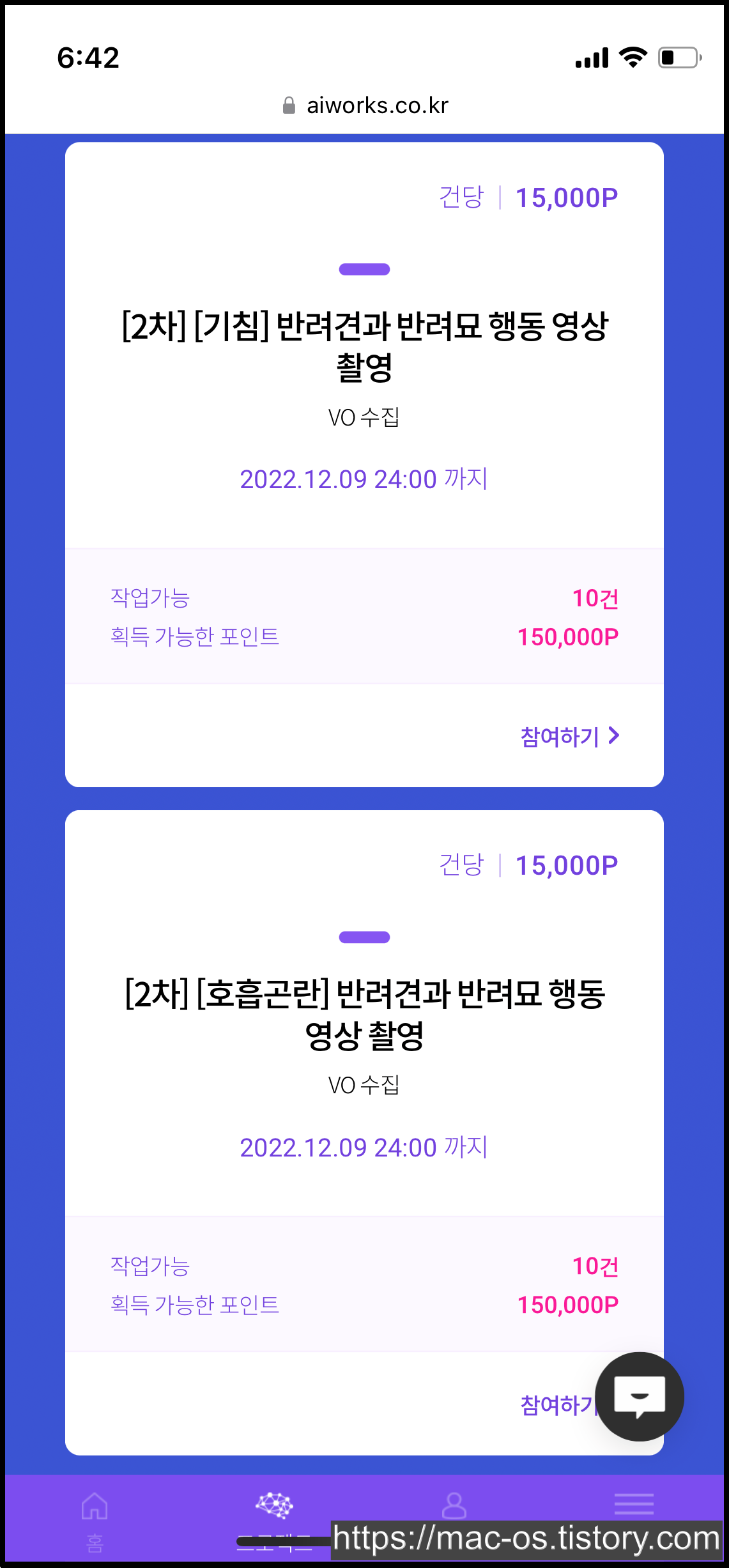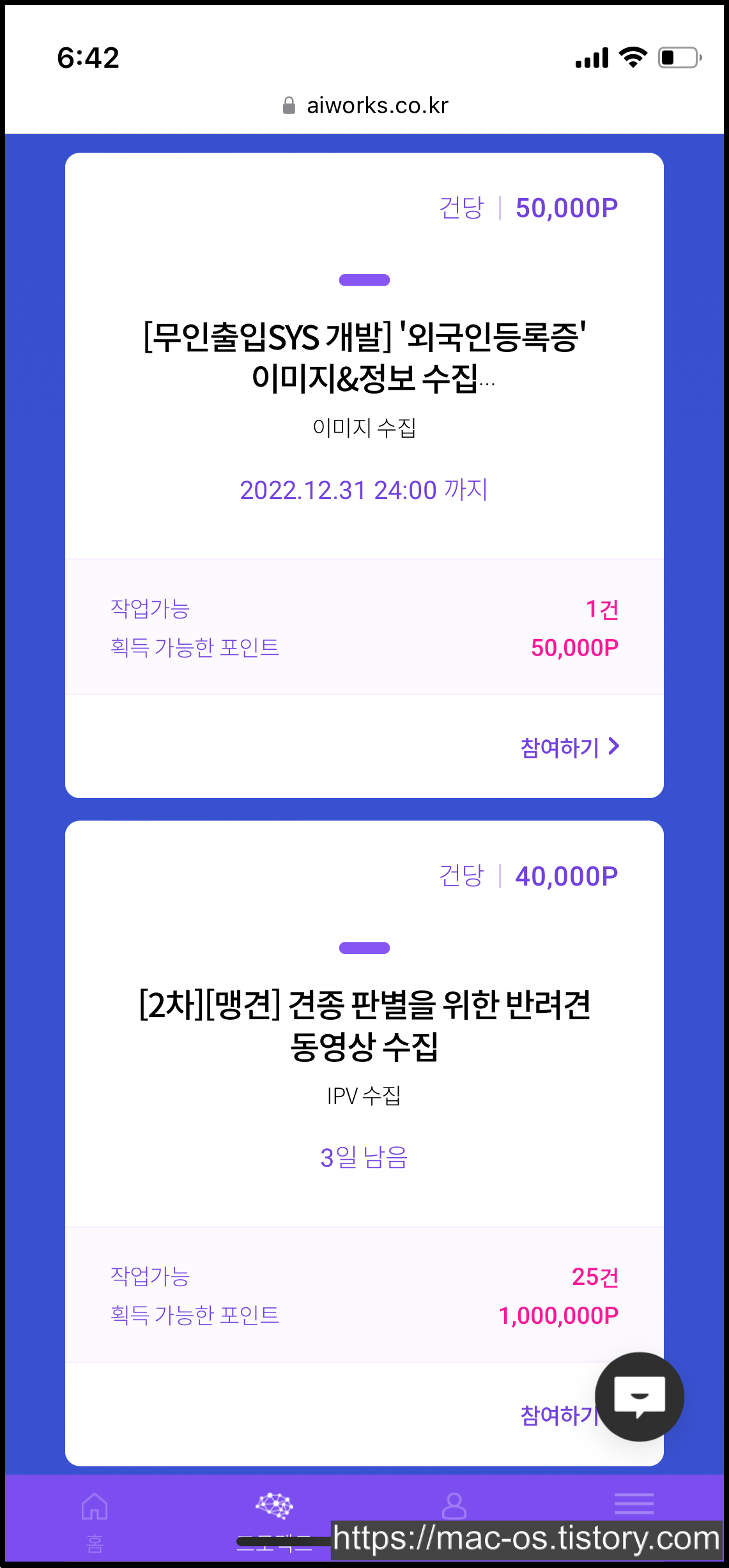 프로젝트를 쭉 둘러봤는데요. 보상 포인트가 높은 건 5만원, 4만원 이렇게 있고, 문장이나 사진 촬영은 건당 100~300원으로 여러 번 참여할 수 있게 되어있었습니다.
