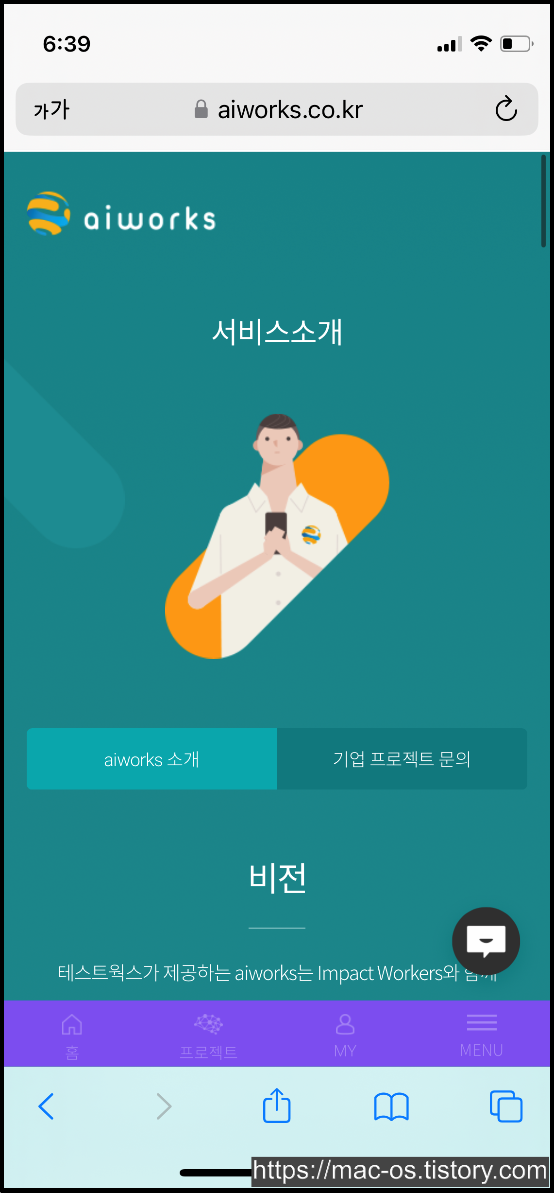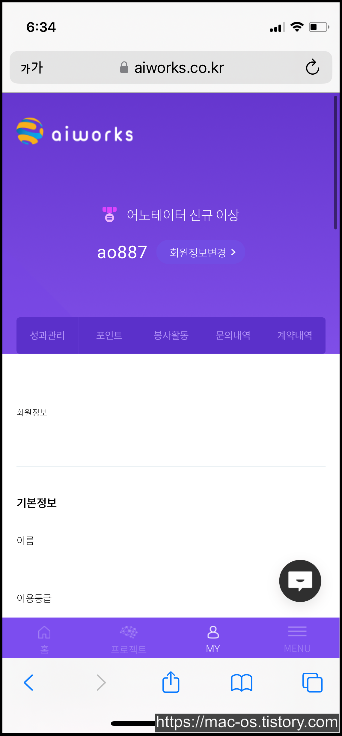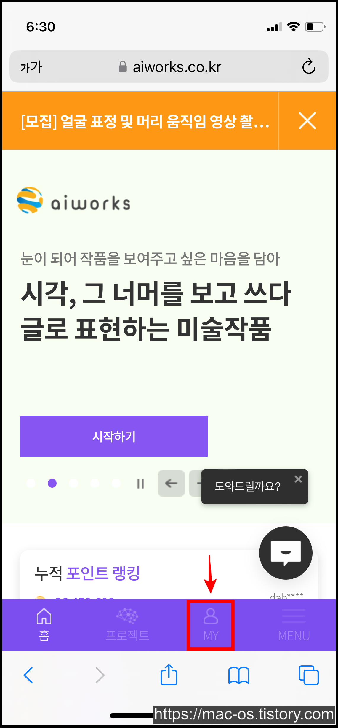 네이버에 에이아이웍스를 검색하거나 구글 플레이 스토어에서 앱을 설치해줍니다. 그리고 [MY]로 이동하여 회원가입을 진행합니다.