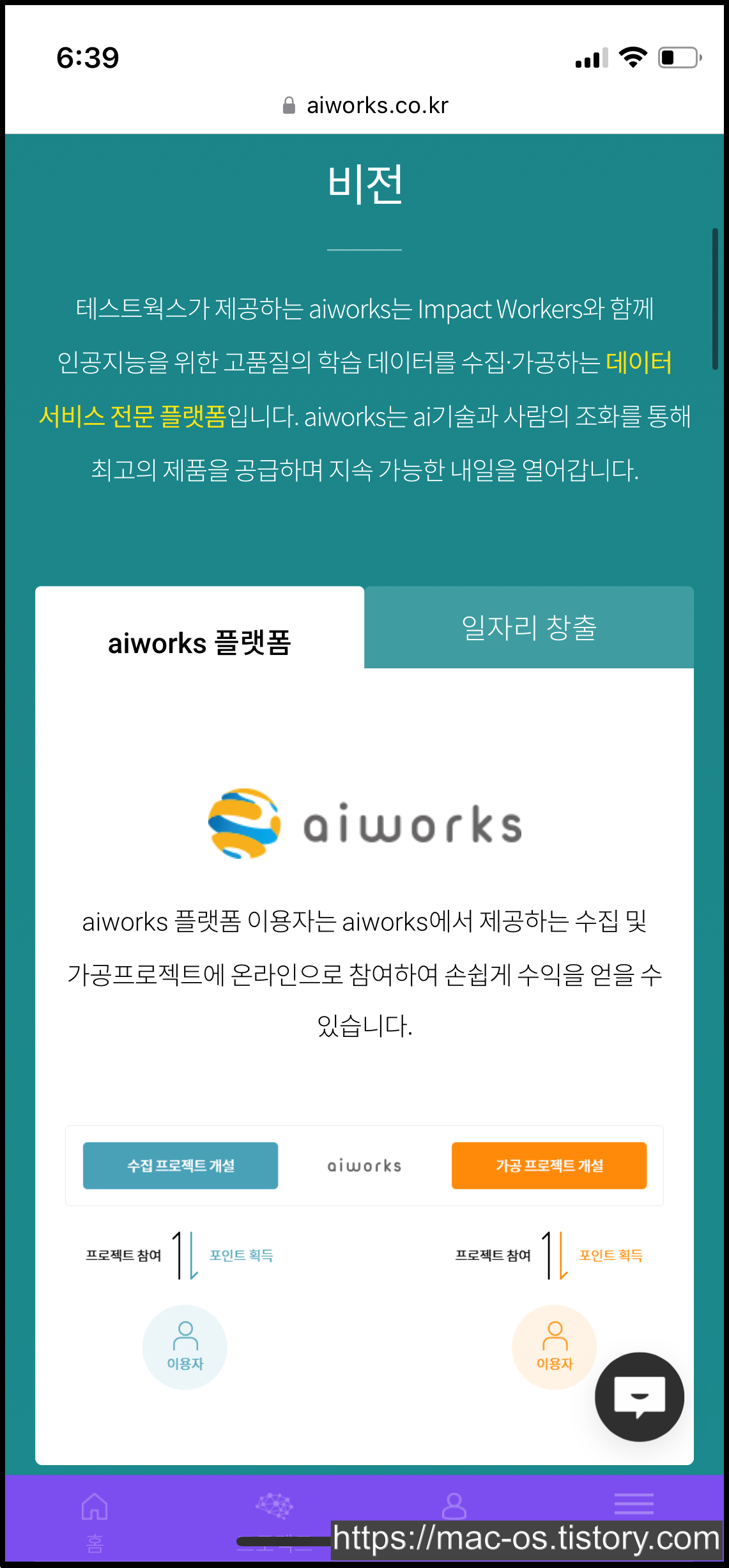 aiworks의 서비스 소개 페이지입니다. aiworks 플랫폼 이용자는 수집 및 가공프로젝트에 온라인으로 참여하여 손쉽게 수익을 얻을 수 있다고 하네요.