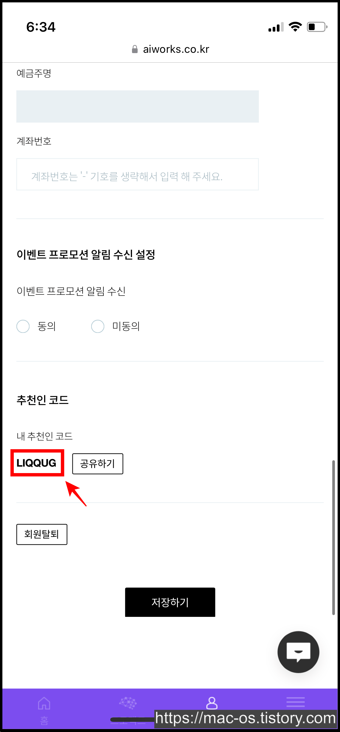 회원가입 후 [MY] > [회원정보변경]으로 이동하시면 자신의 추천인 코드를 확인하실 수 있습니다.