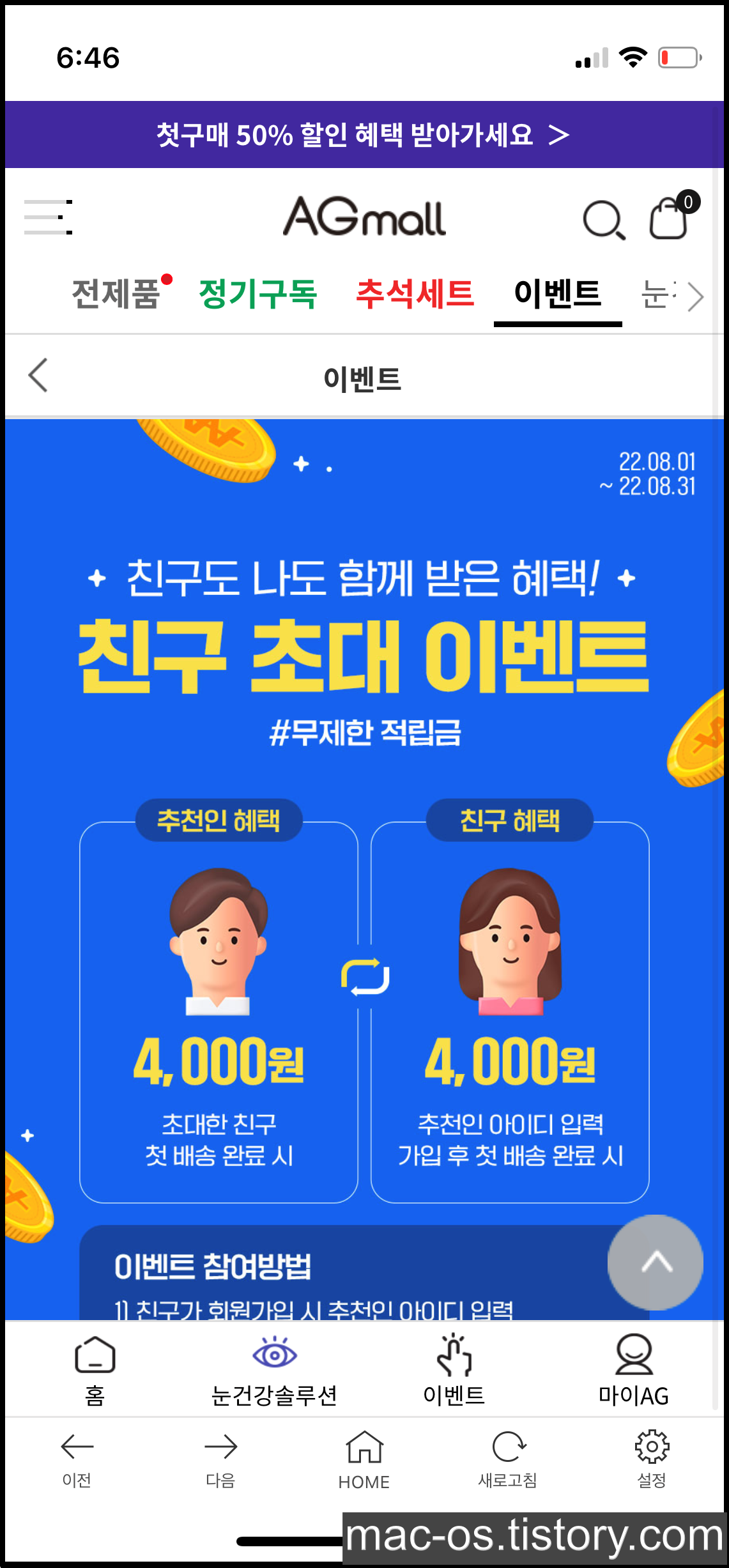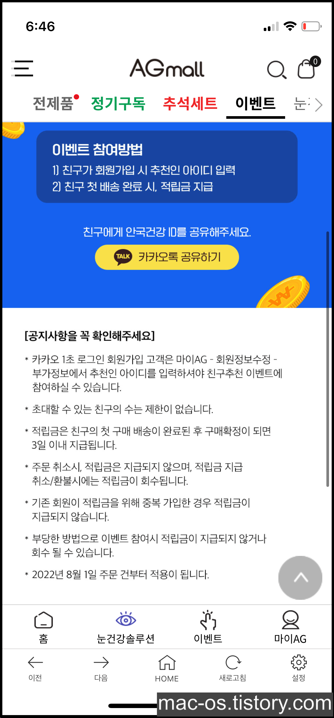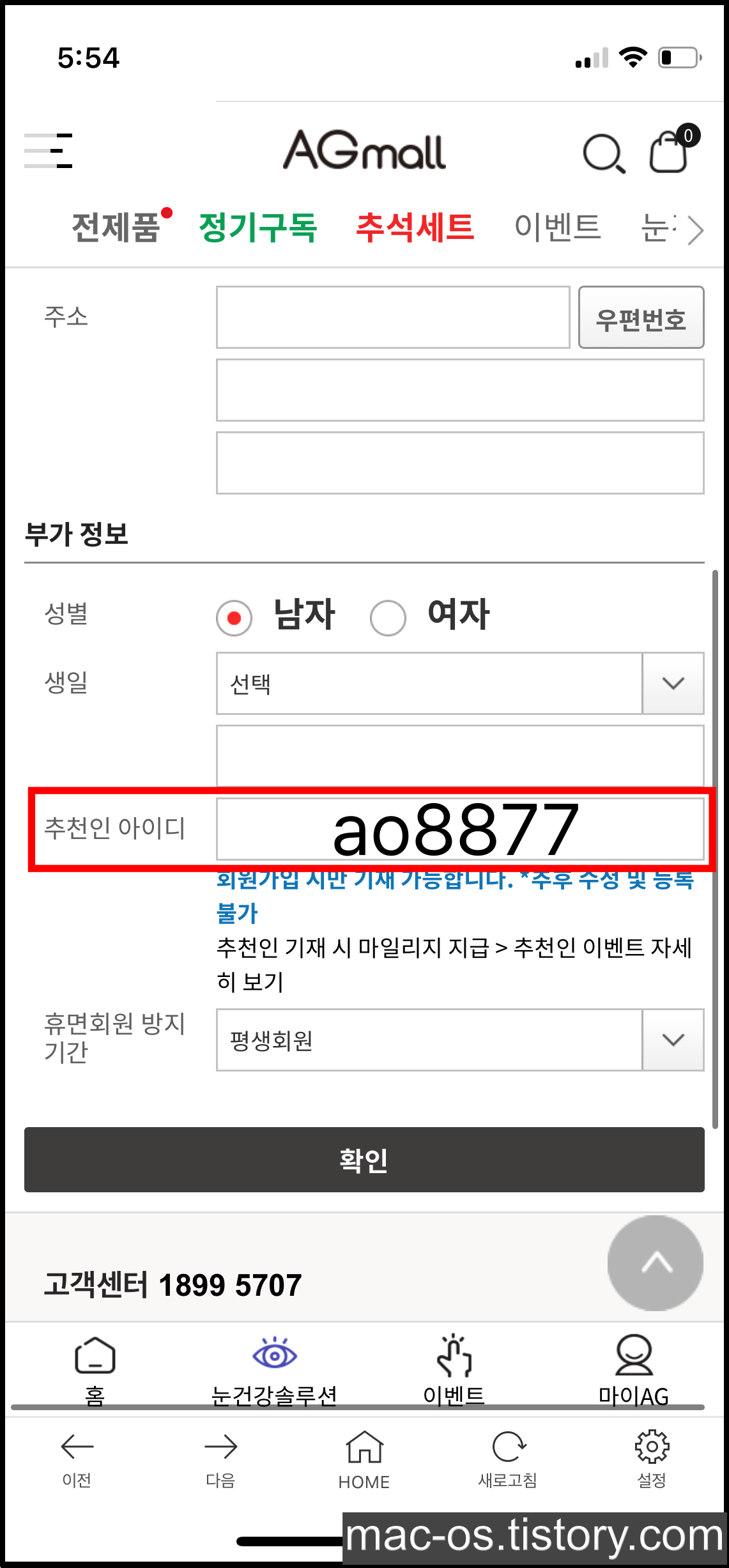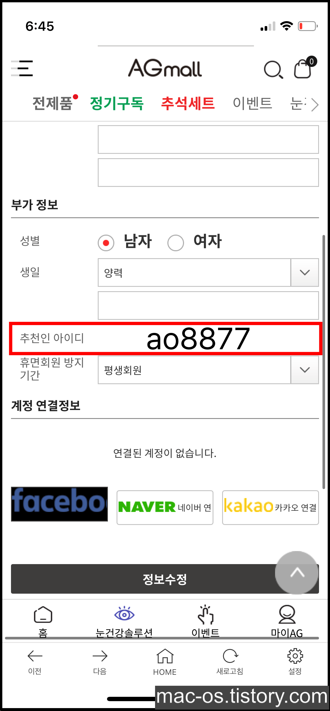 카카오 1초 로그인 회원가입 고객은 [MY AG] > [회원정보 변경] > [부가정보]에서 추천인 아이디를 입력해야 이벤트에 참여할 수 있습니다.