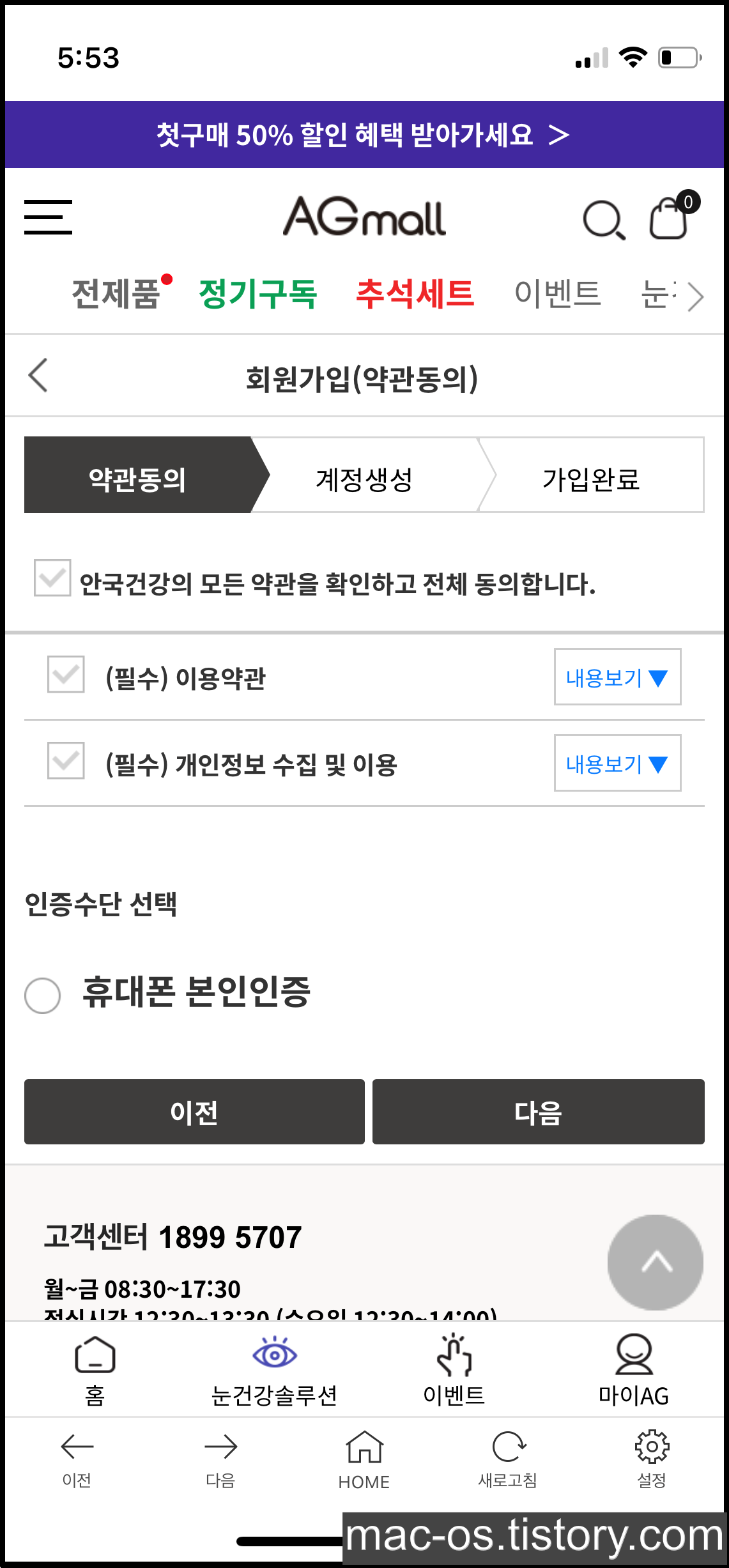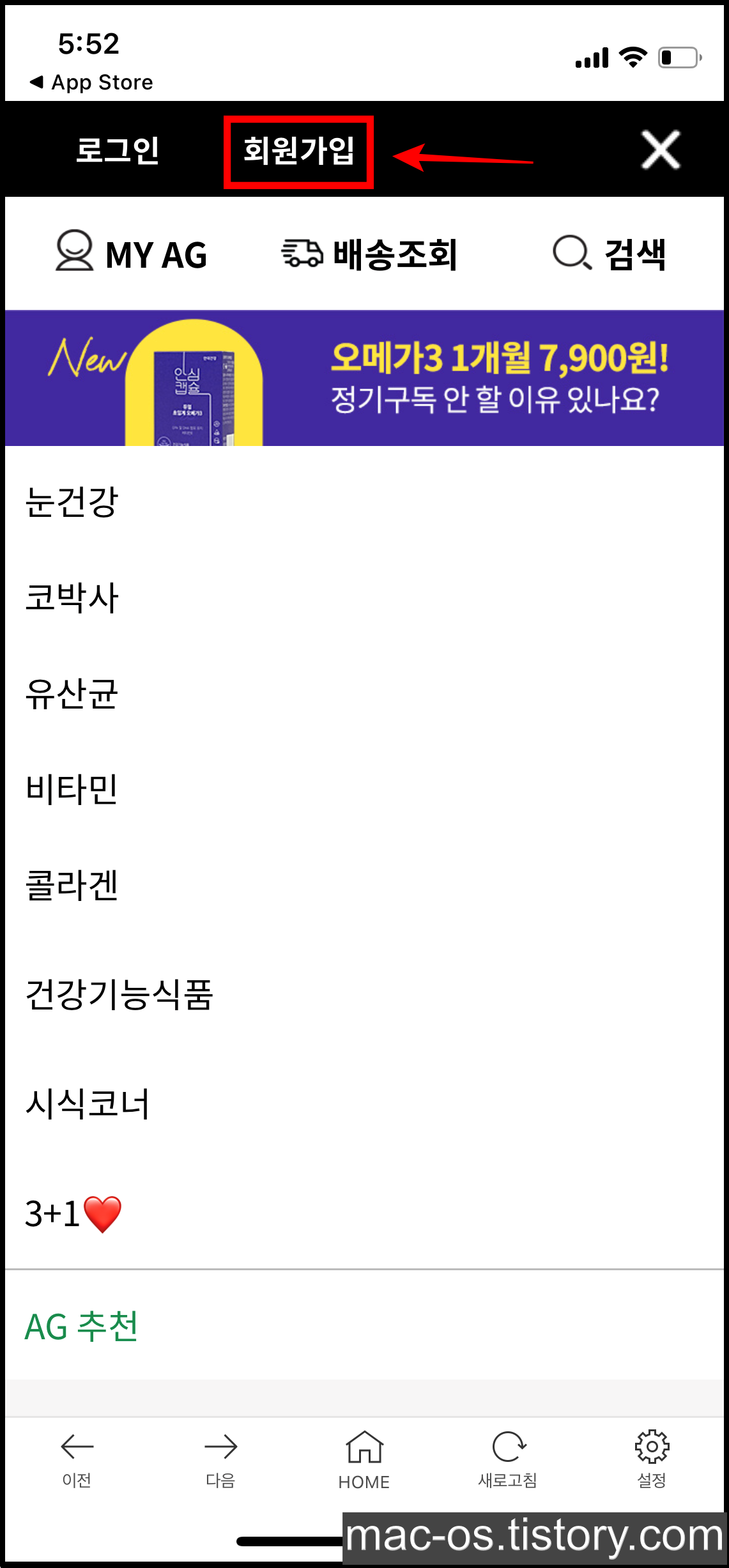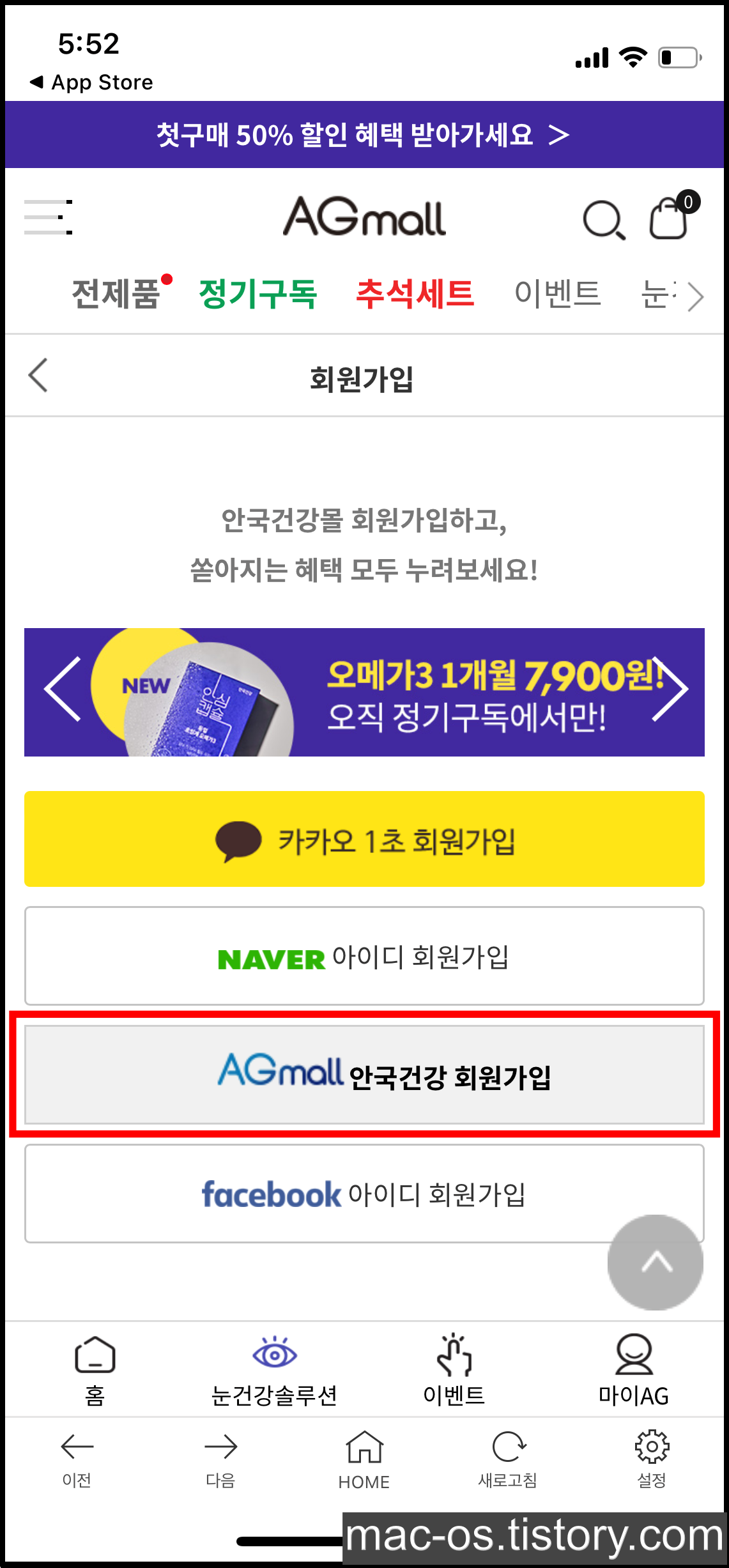 [회원가입] > [안국건강 회원가입]을 터치합니다. 카카오 계정으로 가입하셔도 됩니다.
