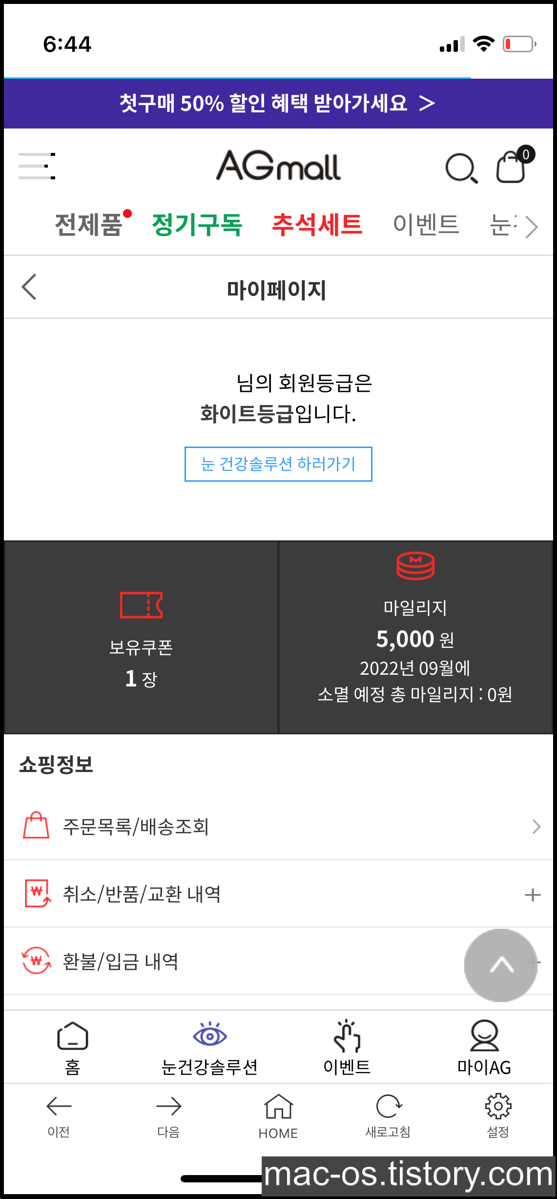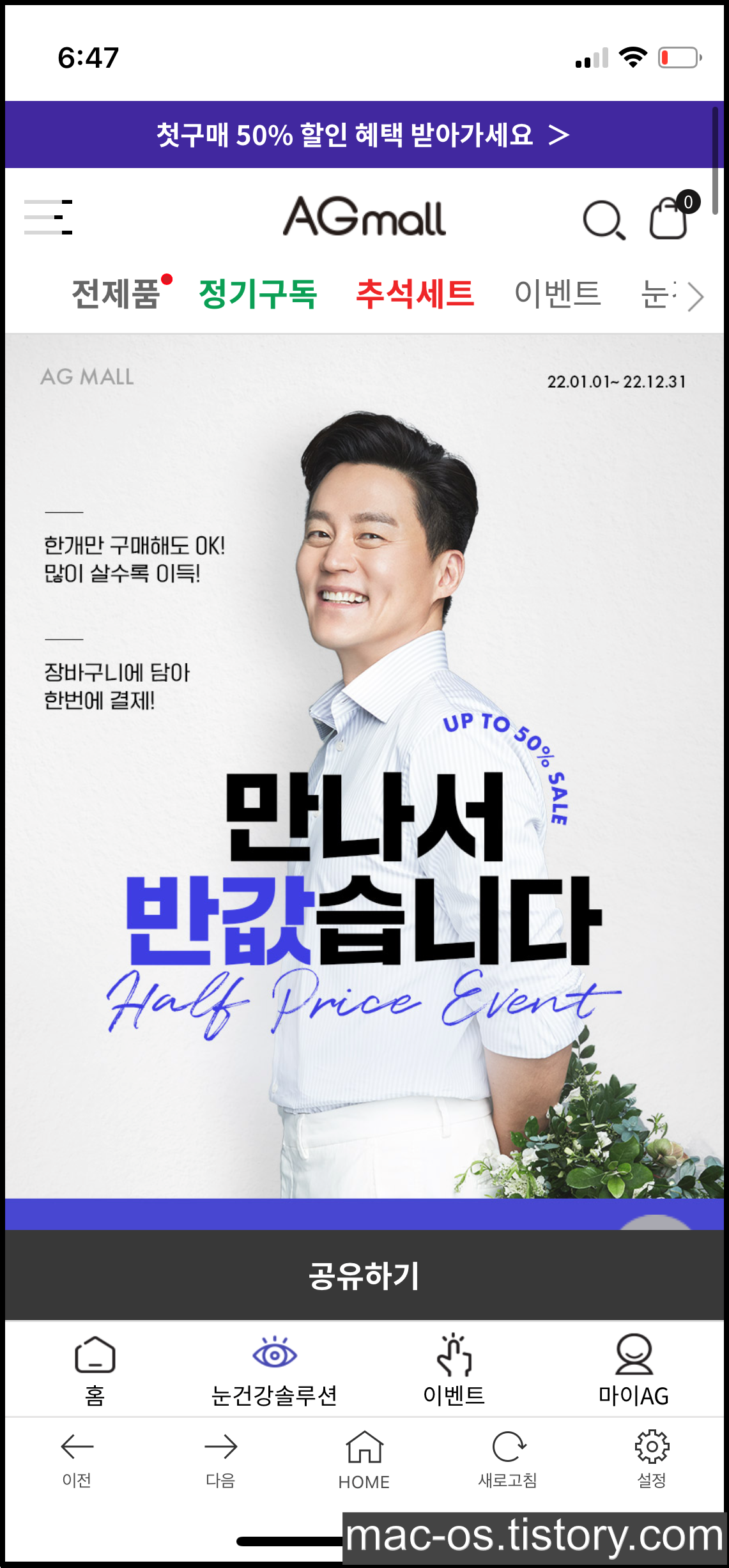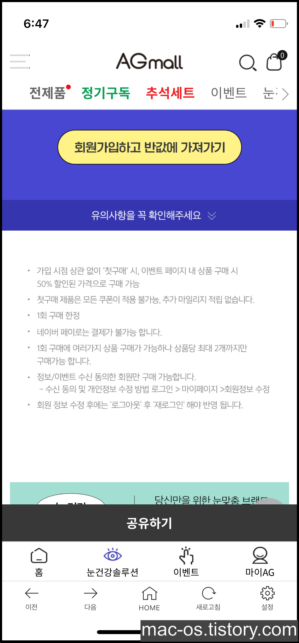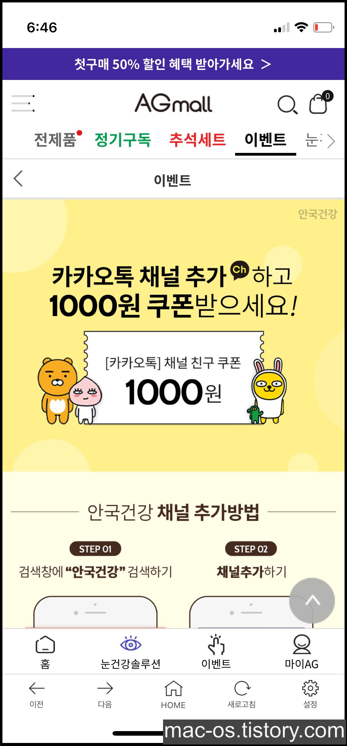 안국건강에서 아직 첫구매하지 않은 신규회원을 대상으로 진행하는 이벤트입니다. 이벤트 페이지에서 소개하는 상품을 50% 저렴하게 구매할 수 있는데요. 1회 구매 한정이고 쿠폰 적용과 마일리지 적립이 불가능하다고 하네요.