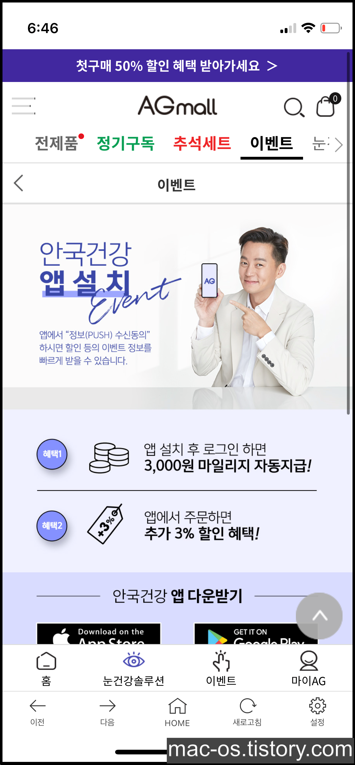 안국건강 앱을 설치하고 로그인하면 마일리지 3,000원이 자동으로 지급됩니다. 그리고 앱에서 주문하면 추가 3% 할인 혜택도 제공된다고 하네요.
