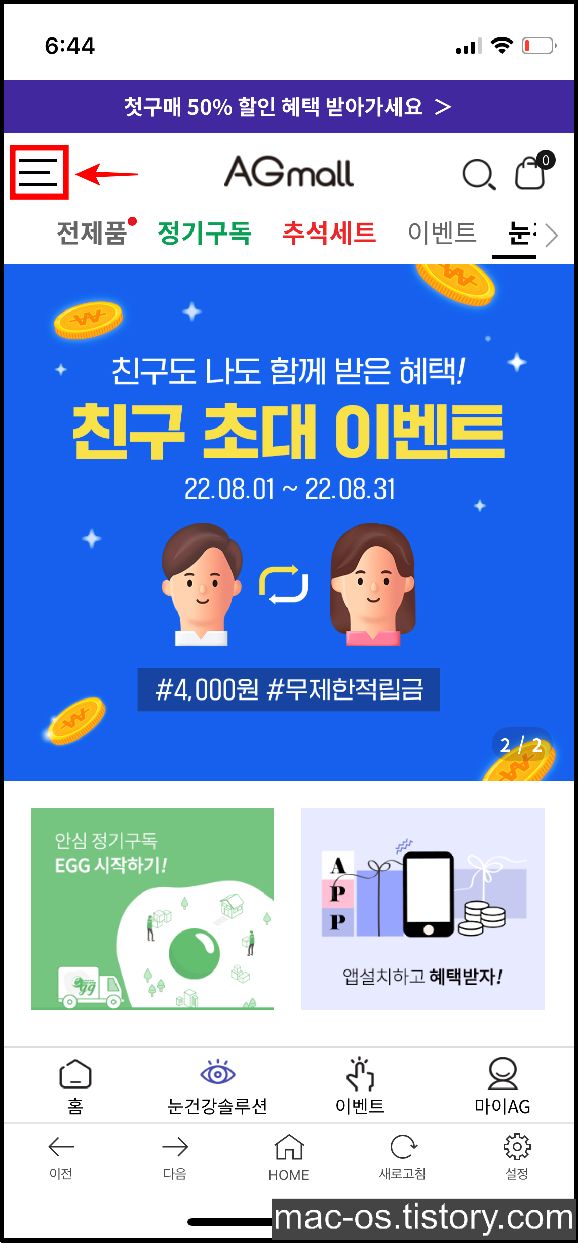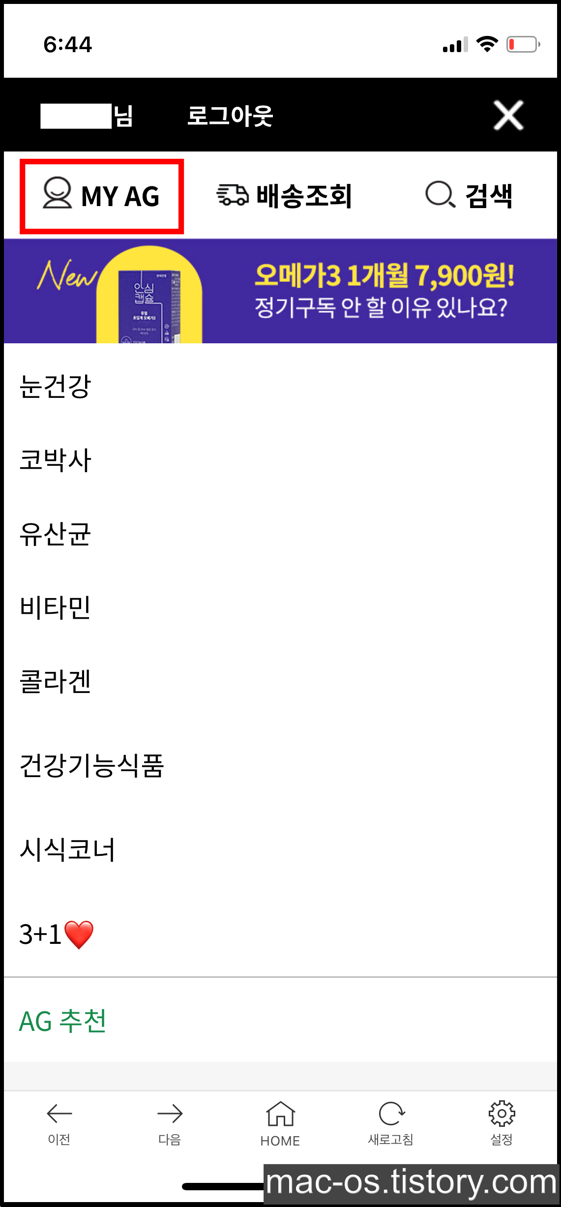 좌측 상단 더보기 메뉴를 클릭하고 [MY AG]로 이동합니다.