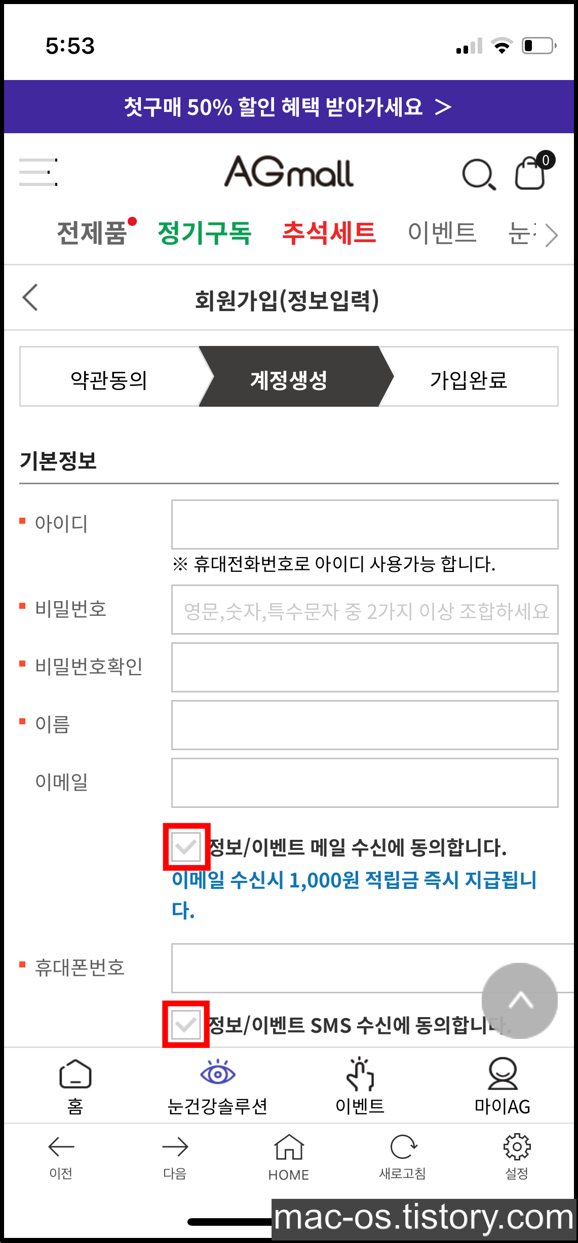 계정생성 페이지에서 이메일과 SNS 수신을 동의할 수 있습니다. 모두 체크하면 마일리지 2,000원이 지급됩니다.