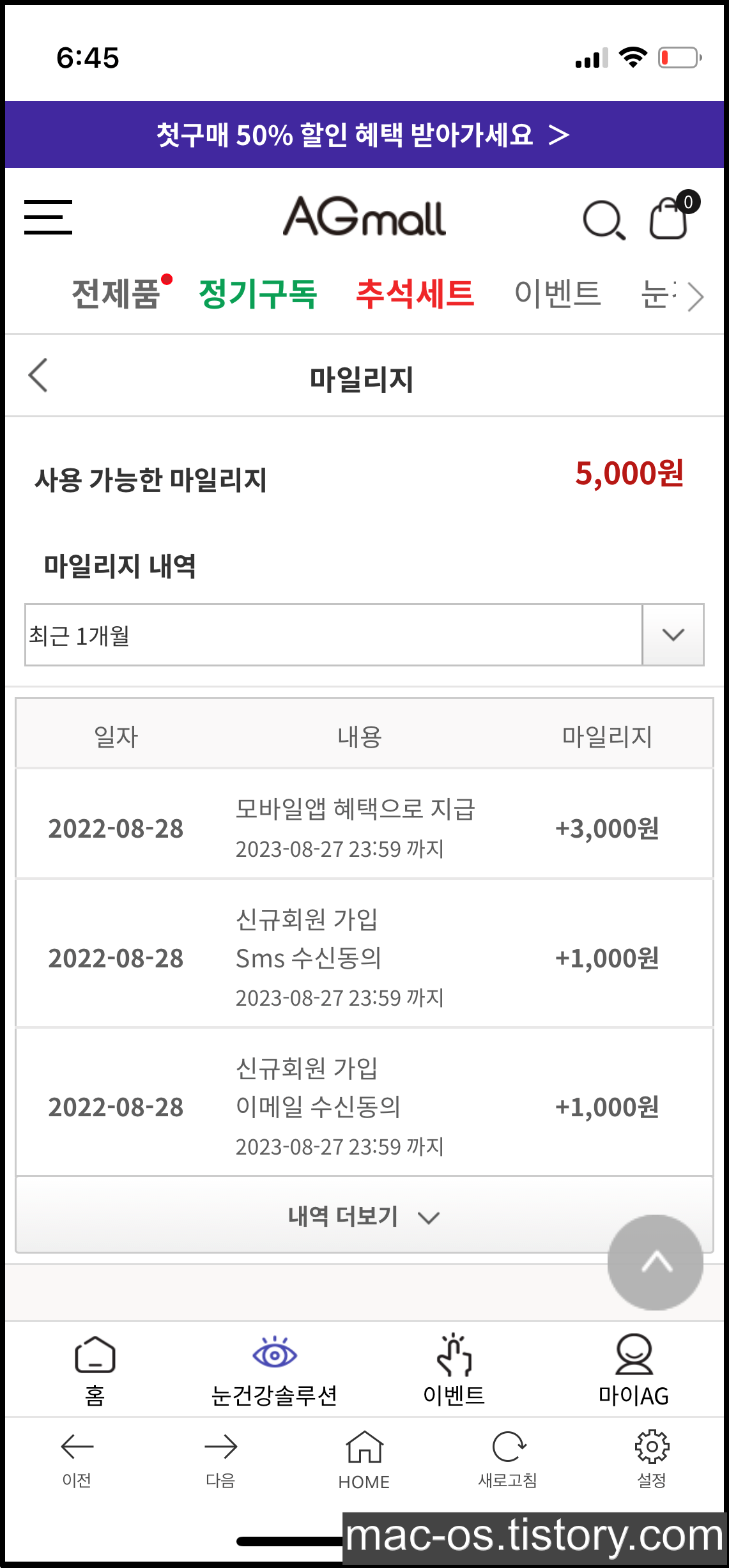 가입할 때 SNS와 이메일 수신동의를 하게 되면 각각 마일리지 1,000원으로 총 2,000원을 받을 수 있으며, 마일리지는 눈과 코에 도움이 되는 영양제를 구매할 때 현금과 같이 100% 전액 사용이 가능합니다.