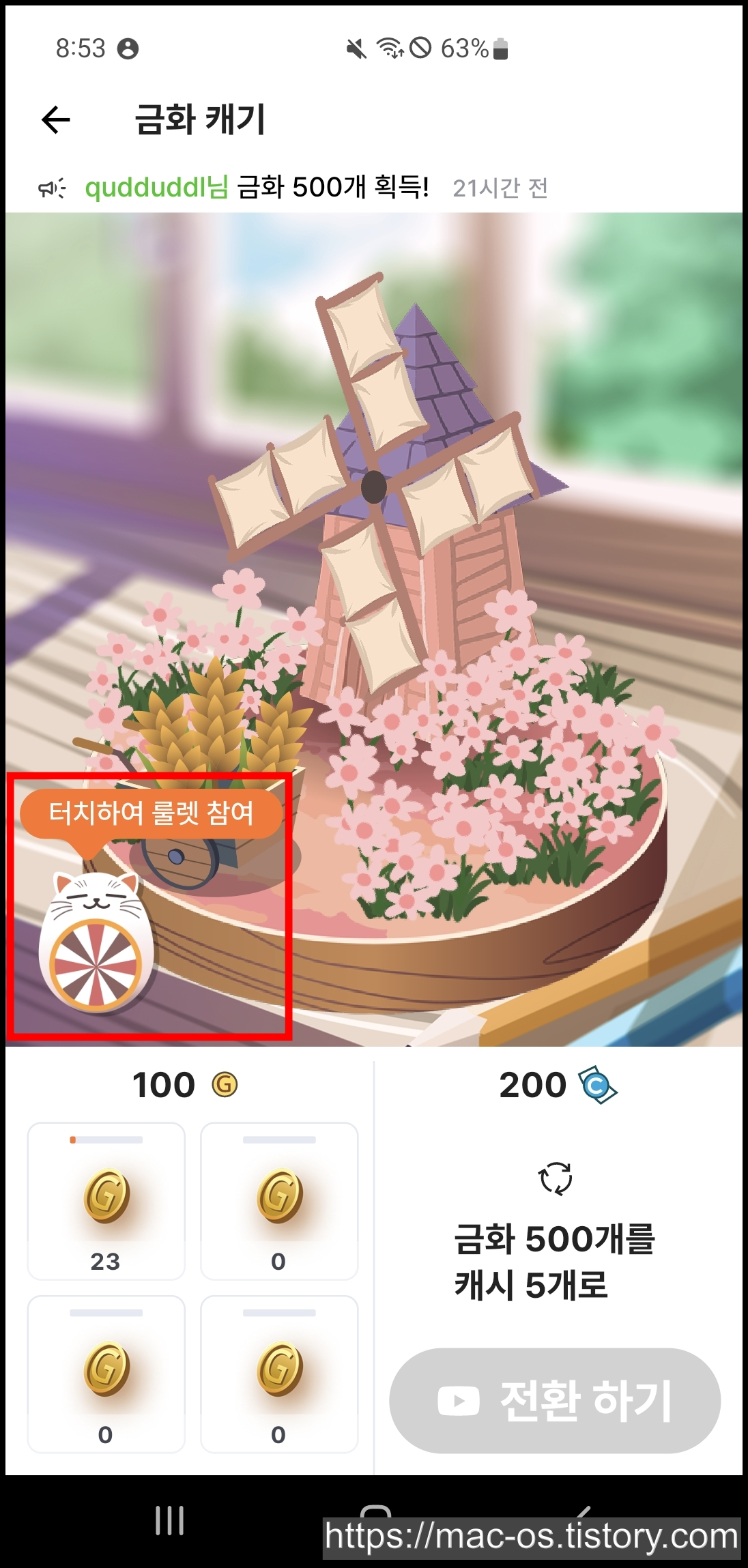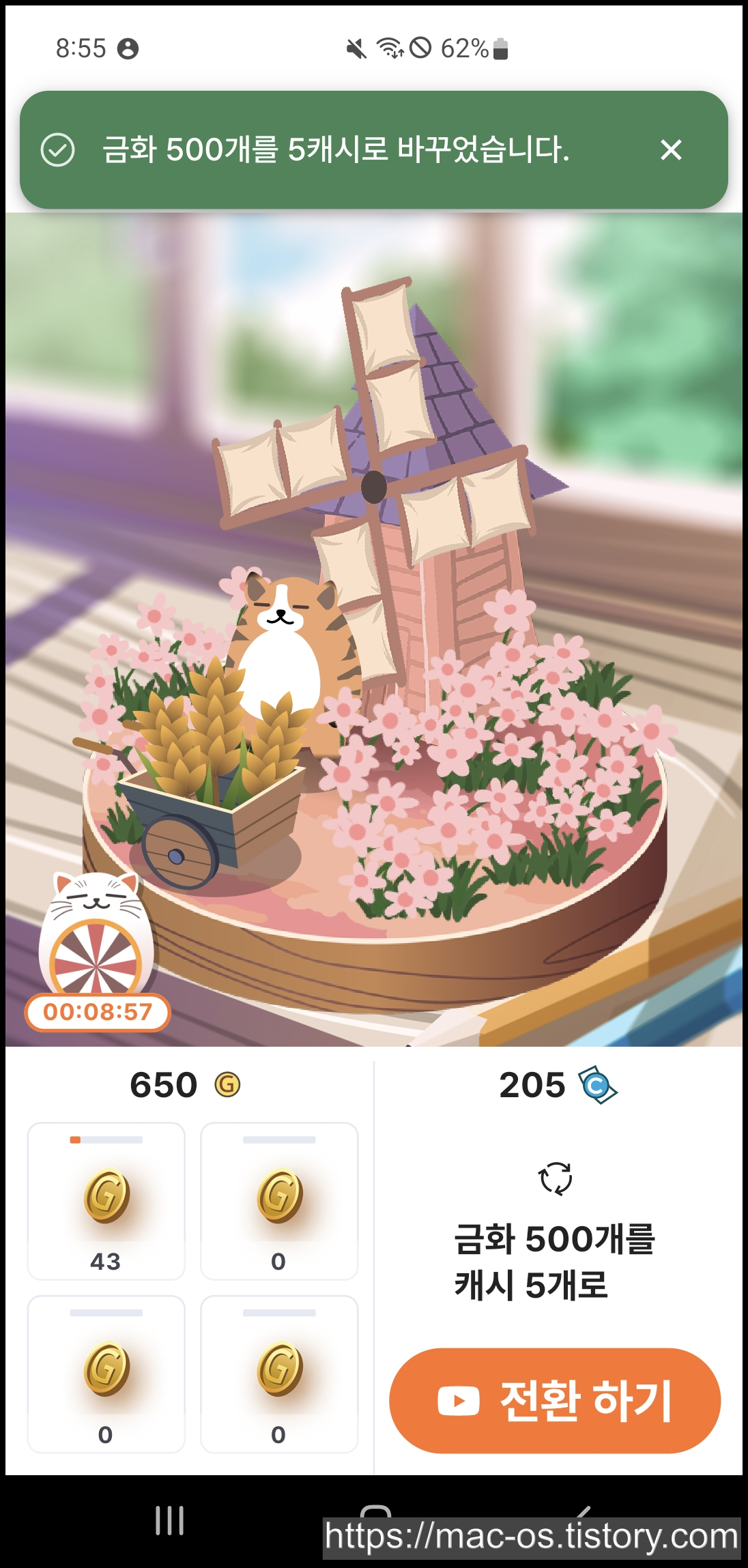 금화는 오른쪽 하단의 [전환 하기] 버튼을 눌러 광고를 시청하면 500금화당 5캐시로 전환이 가능합니다. 금화가 1시간에 몇개나 쌓이는지 계산해봤습니다.