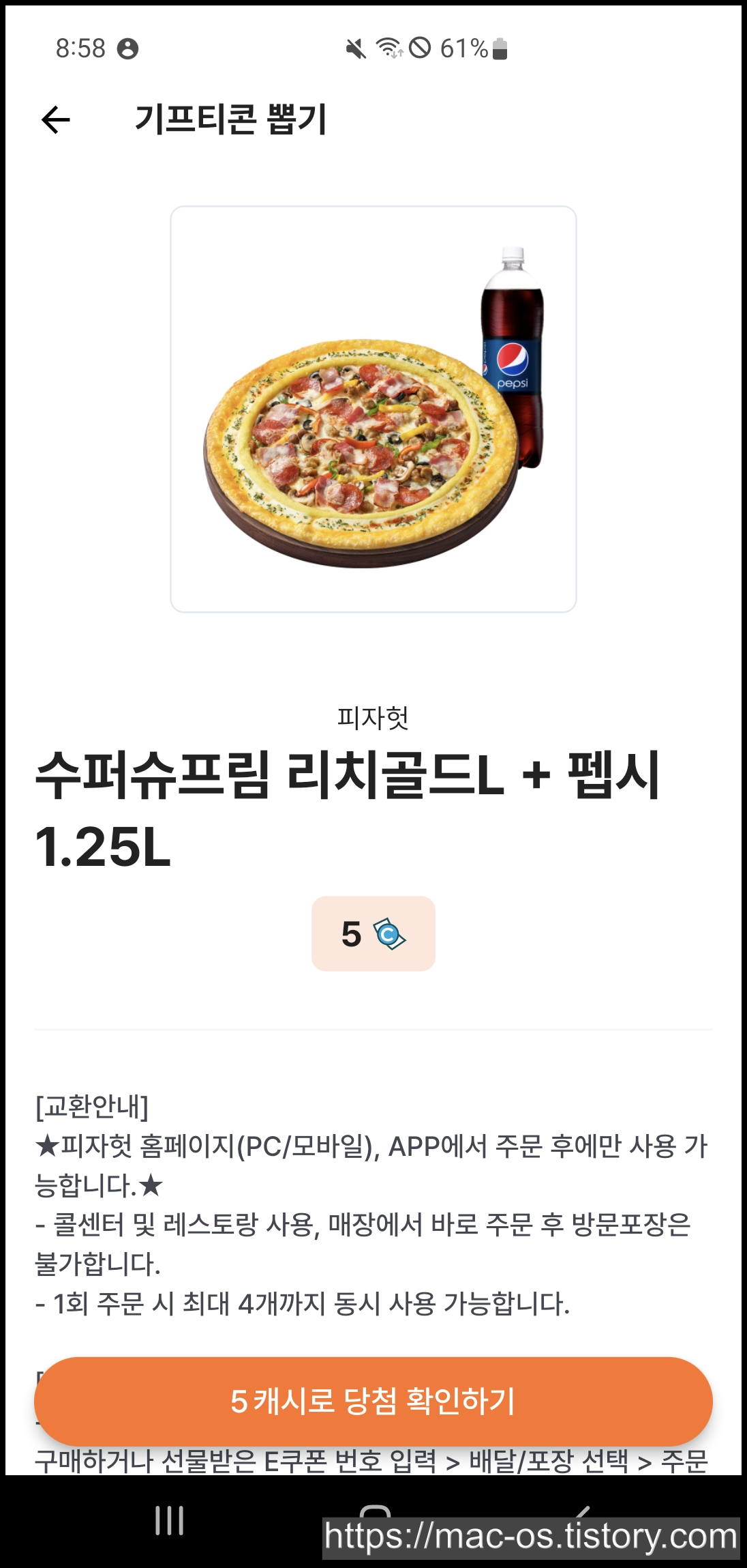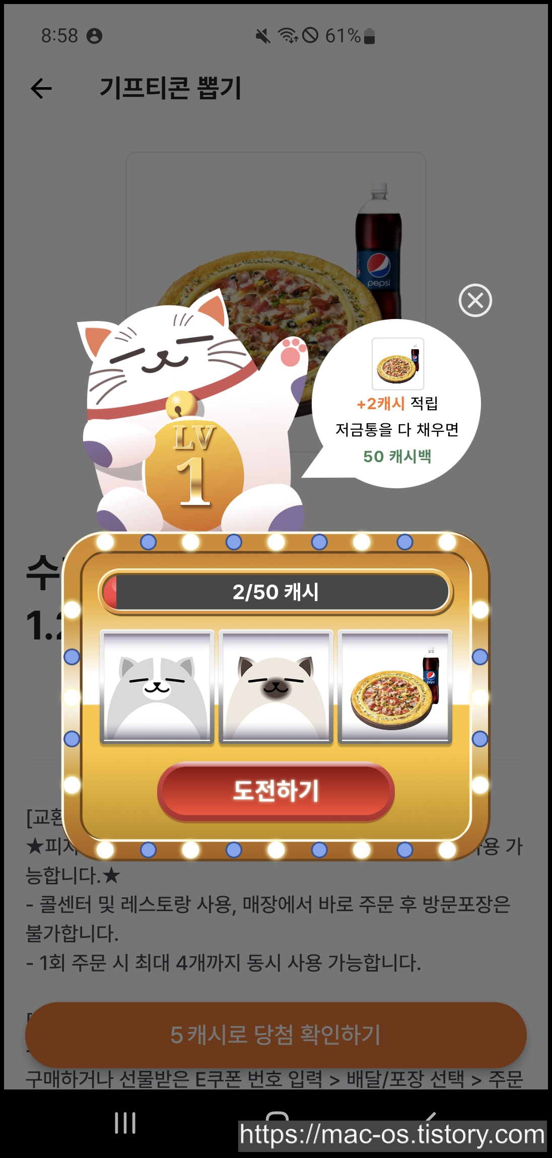 그리고 기프티콘 사진이 1개라도 등장하면 2캐시가 저금통에 적립되는데, 저금통을 다 채우면 50캐시를 준다고 하네요.