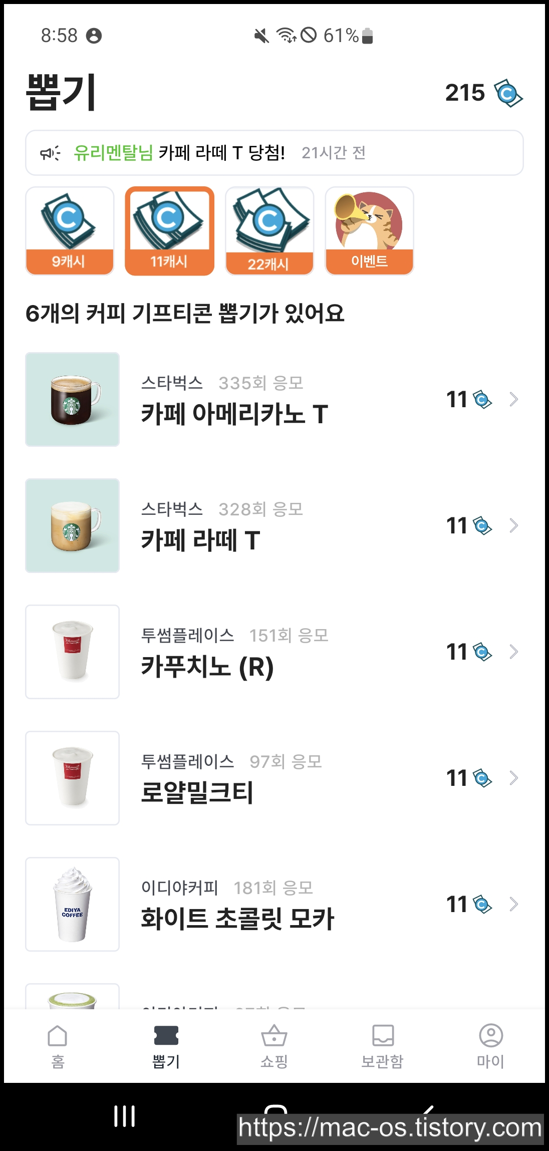 9캐시, 11캐시, 22캐시, 이벤트 이렇게 총 4가지로 구성되어 있고 1번 뽑을 때마다 지불하는 캐시의 양에 따라 기프티콘이 더 비싼 것으로 구성되어 있습니다.