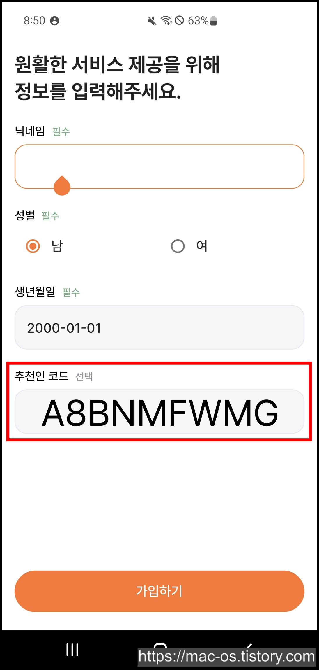 회원가입 페이지에서 닉네임과 성별, 생년월일, 추천인 코드를 입력하실 수 있는데요. 여기서 추천인 코드를 입력하시면 100캐시를 더 받으실 수 있어요.
