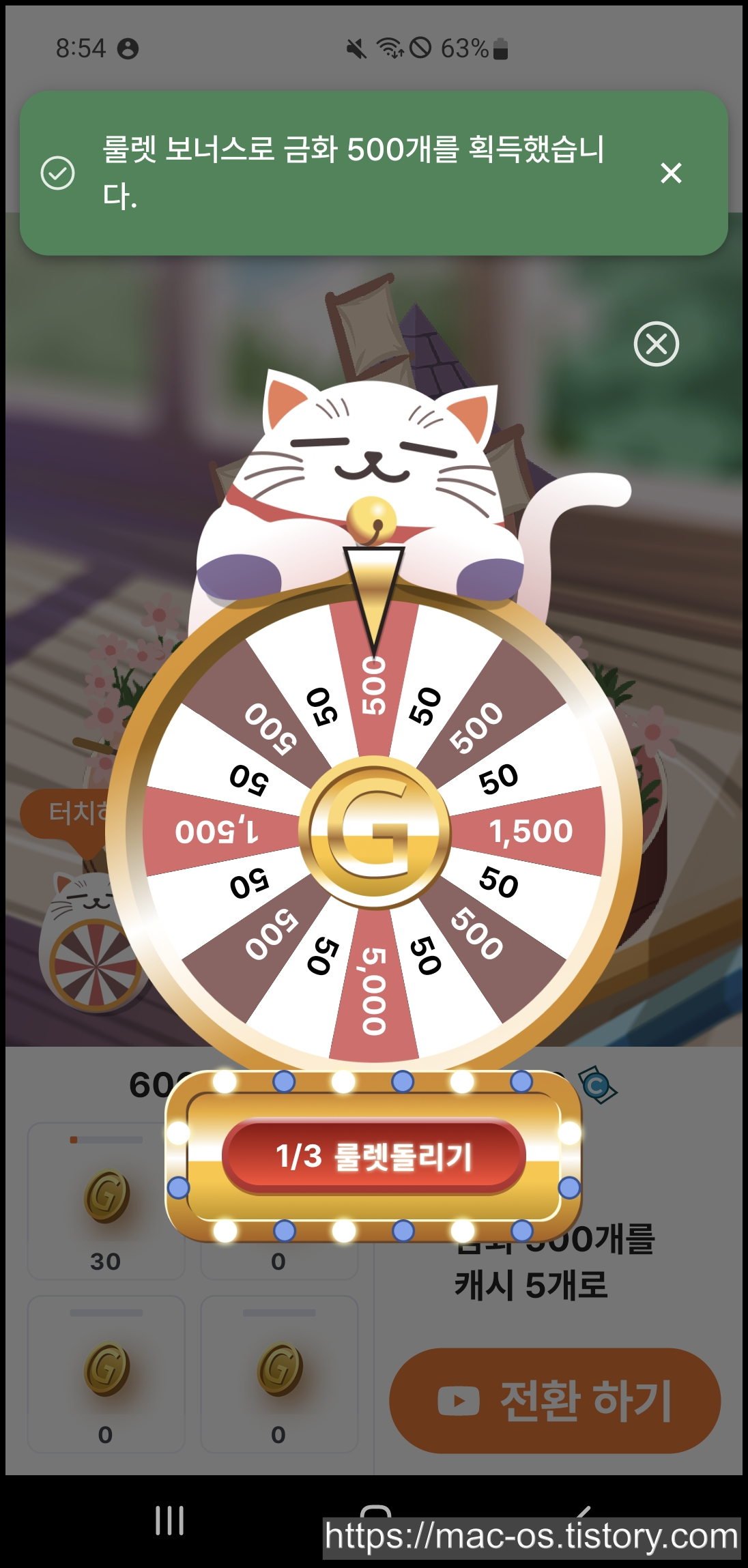 캐시캣에서는 시간이 지나면서 자동으로 금화가 쌓이는데요. 홈 화면에 있는 [금화 캐기]를 누르면 2번째 사진과 같은 화면이 나타나는데, 10분마다 룰렛을 돌려 금화를 추가로 얻으실 수도 있습니다. 저는 3번을 돌렸는데 500금화가 2번, 50금화가 1번 나왔네요.