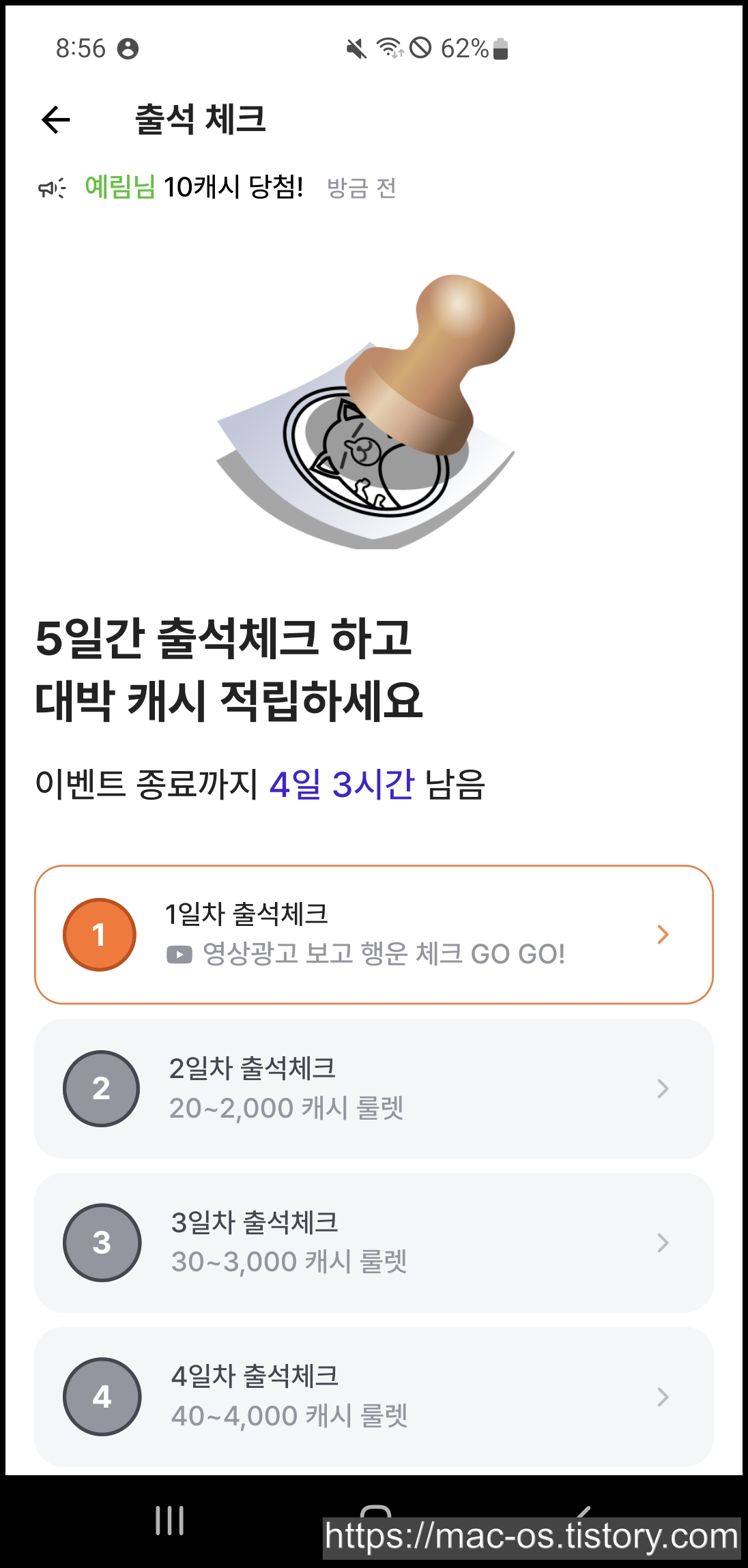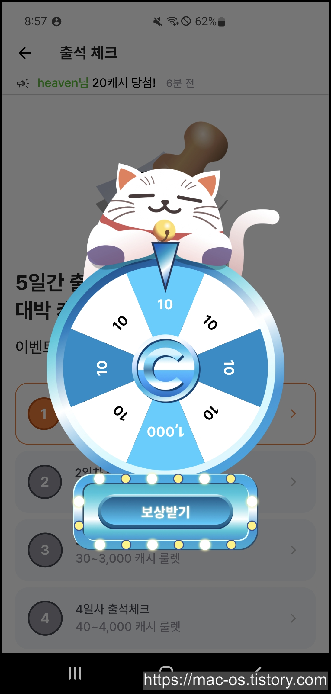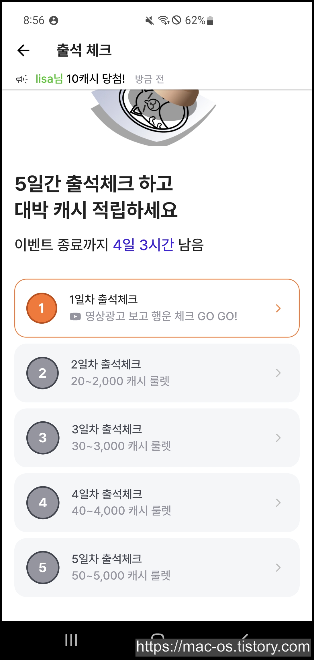 1일차에는 10~1,000캐시, 2일차에는 20~2,000캐시, 이렇게 5일차까지 받으실 수 있습니다. 5일차까지 출석을 다하면 다시 1일차가 되는 건지 아니면 끝나는 건지 모르겠네요.