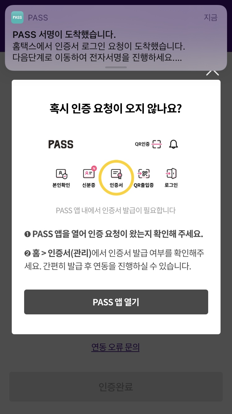 저는 PASS 앱을 사용하였습니다. 로그인 방법을 선택하면 주민번호 뒷자리를 입력하게 됩니다. 입력하시고 PASS에서 인증 요청을 확인해주세요.
