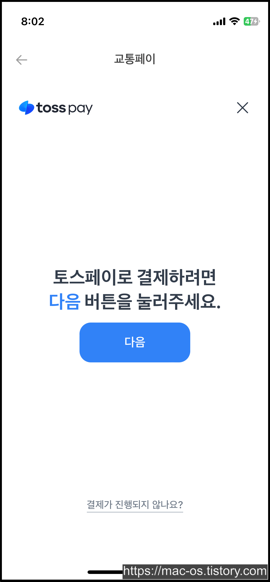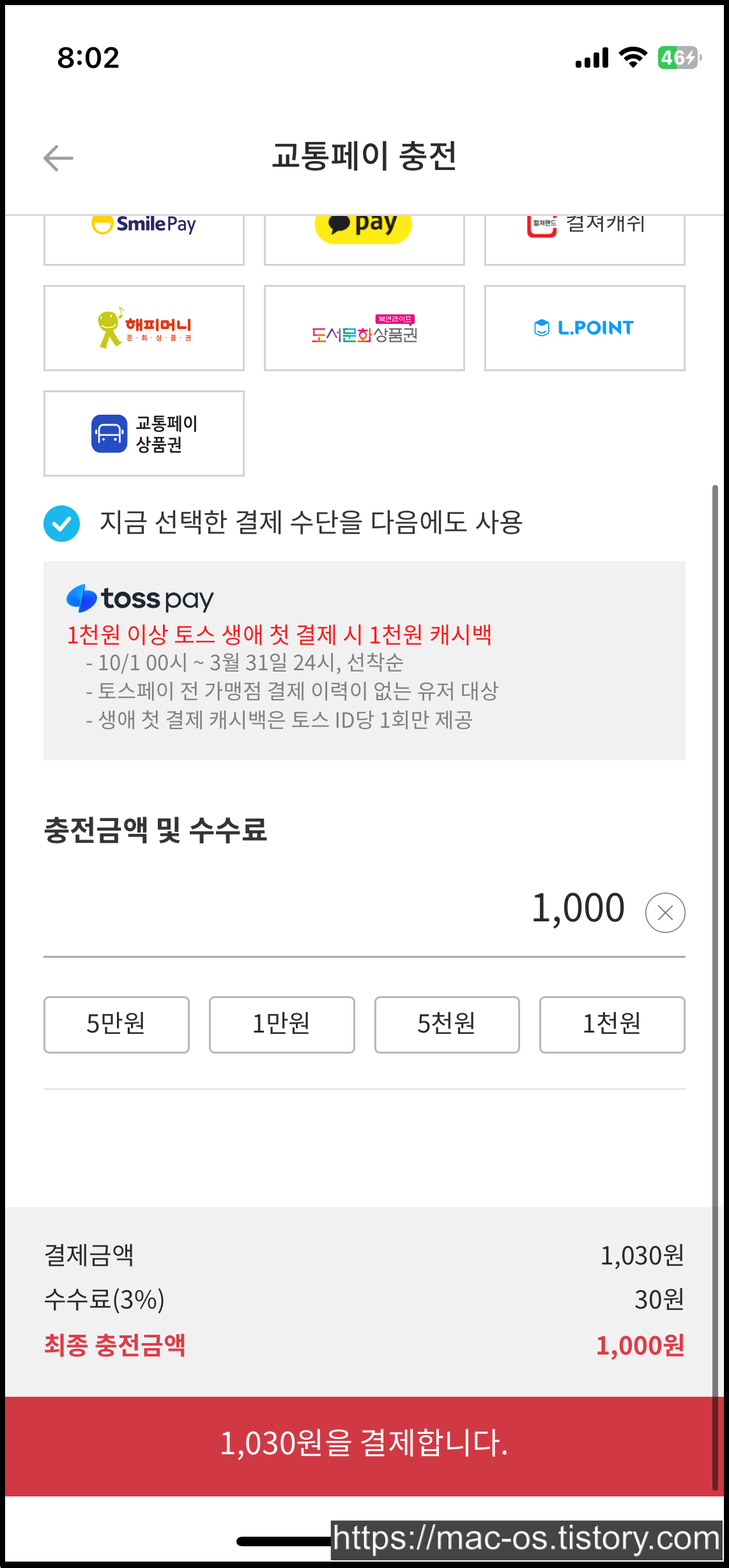 토스를 한번도 사용하지 않으셨던 분들은 1천원 이상 결제하면 1천원을 다시 돌려받으실 수 있는데요. 저는 토스를 자주 써서 토스페이로 1천원을 결제했어요.