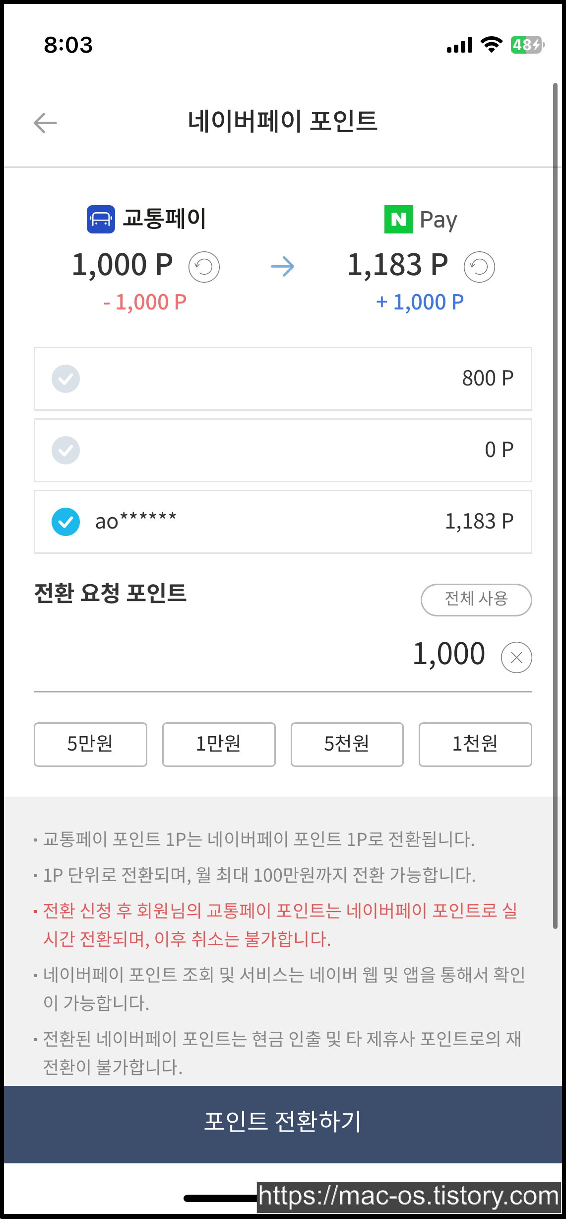 교통페이 포인트 1P는 네이버페이 포인트 1P로 전환되고 월 최대 100만원까지 전환이 가능해요. 전환 신청 후 교통페이 포인트는 네이버페이 포인트로 실시간 전환되며 이후 취소할 수 없어요.