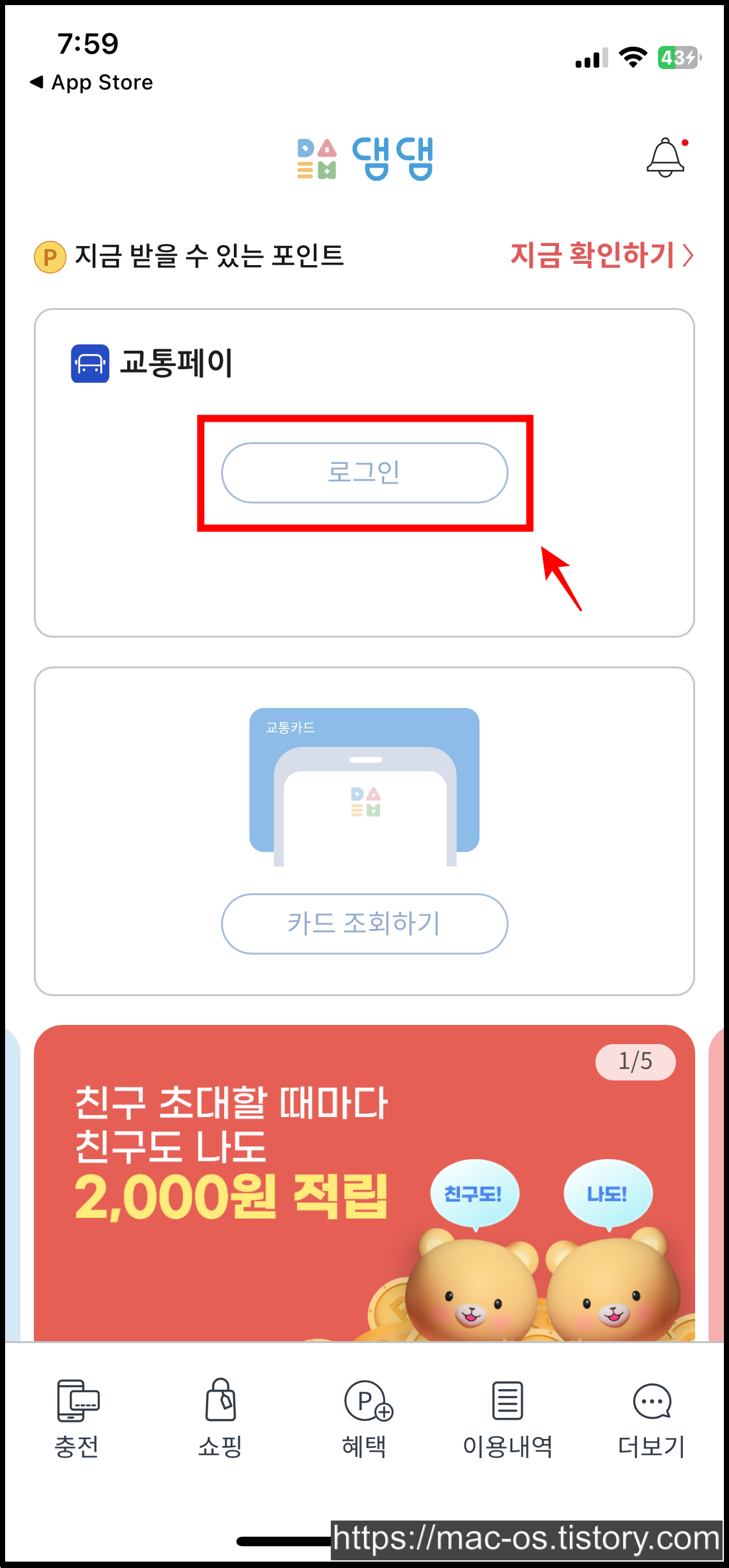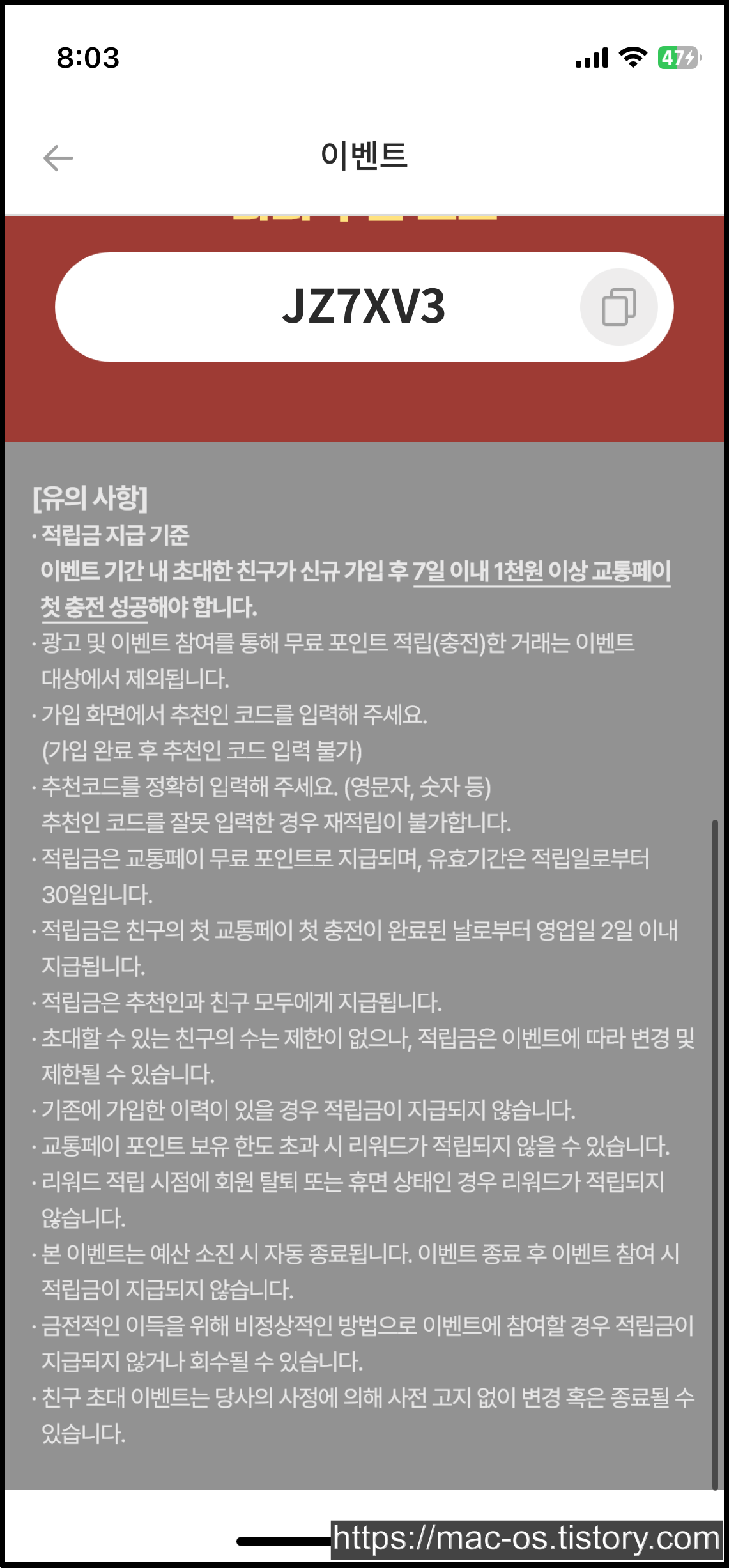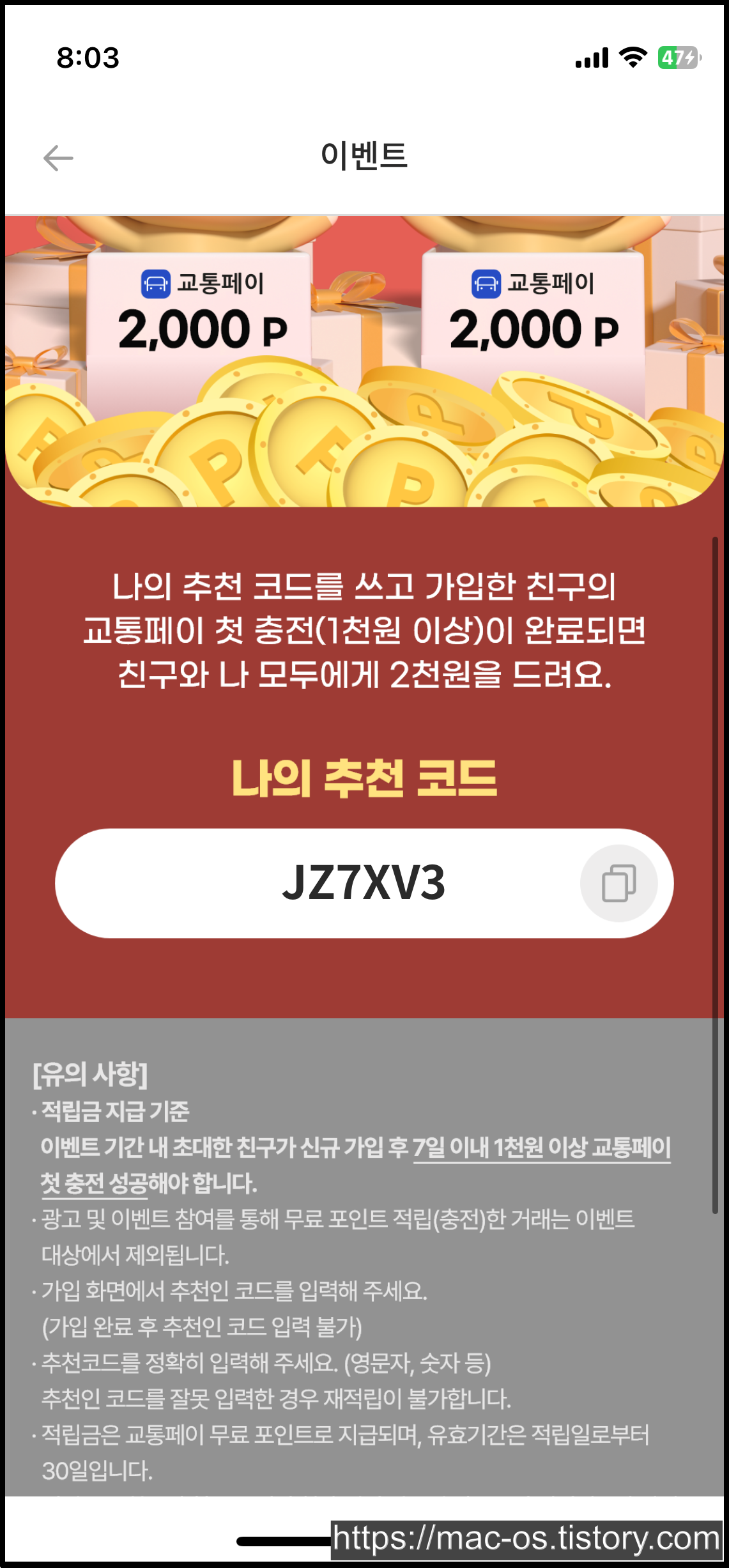 나의 추천코드도 여기서 확인할 수 있구요. 이벤트 기간 내 초대한 친구가 신규 가입 후 7일 이내 1천원 이상 교통페이 첫 충전에 성공해야 한대요.