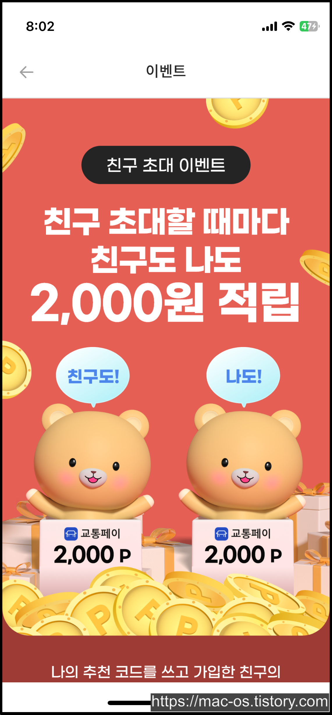 친구초대 이벤트 페이지인데요. 나의 추천코드를 쓰고 가입한 친구의 교통페이 첫 충전(1천원 이상)이 완료되면 친구와 나 모두에게 2천원을 준다고 적혀있네요.