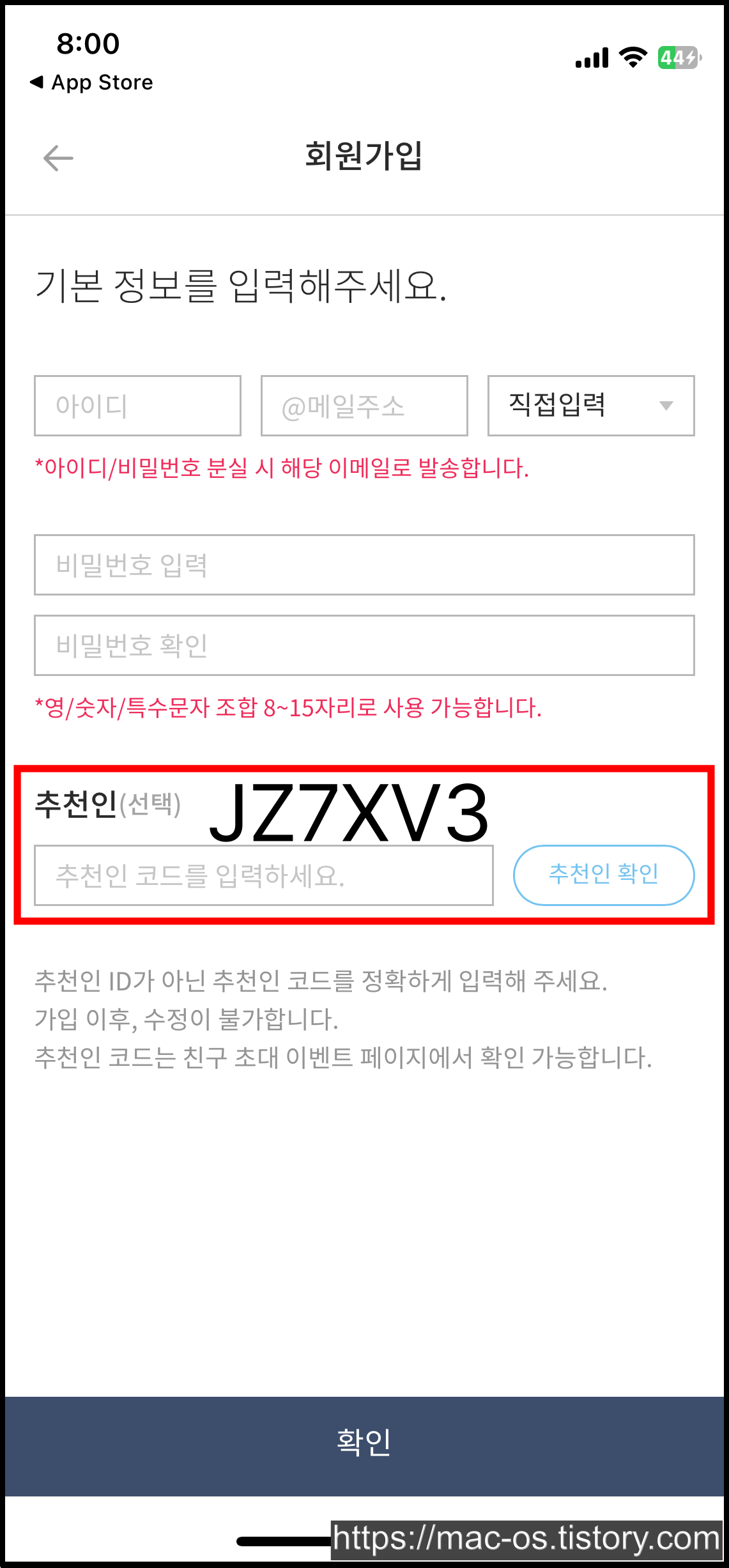 회원가입 페이지에서 아이디와 비밀번호, 추천인 코드를 입력하면 가입이 완료됩니다. 추천인 코드를 꼭 입력하셔야 이벤트 참여가 가능하니 주의해주세요!!