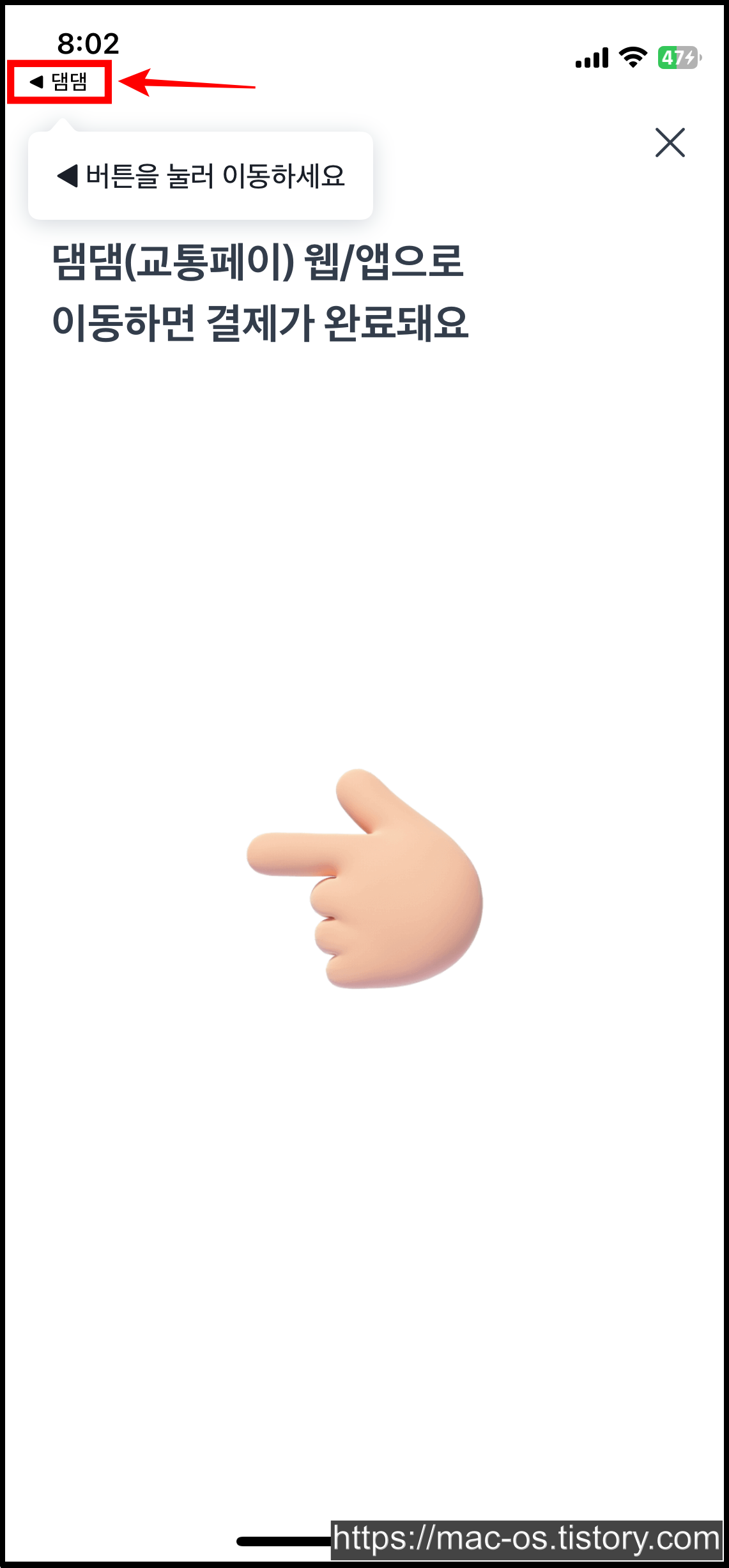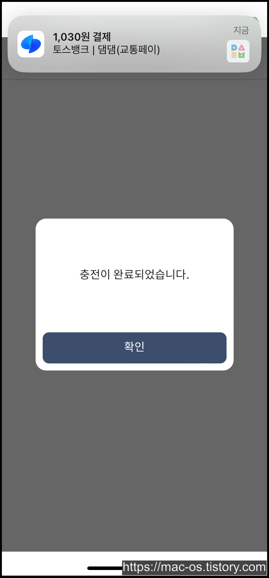 수수료 30원을 합친 1,030원이 결제됩니다. 결제를 완료하고 댐댐 앱으로 돌아와주세요.