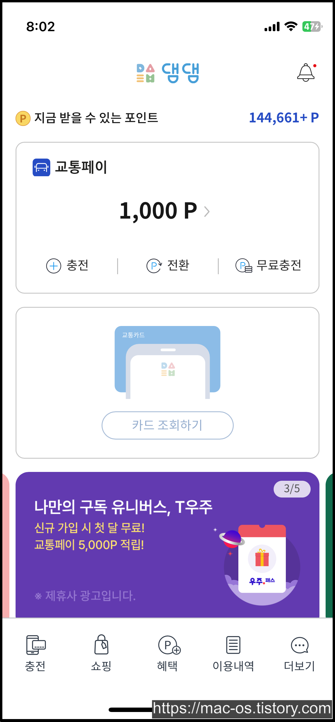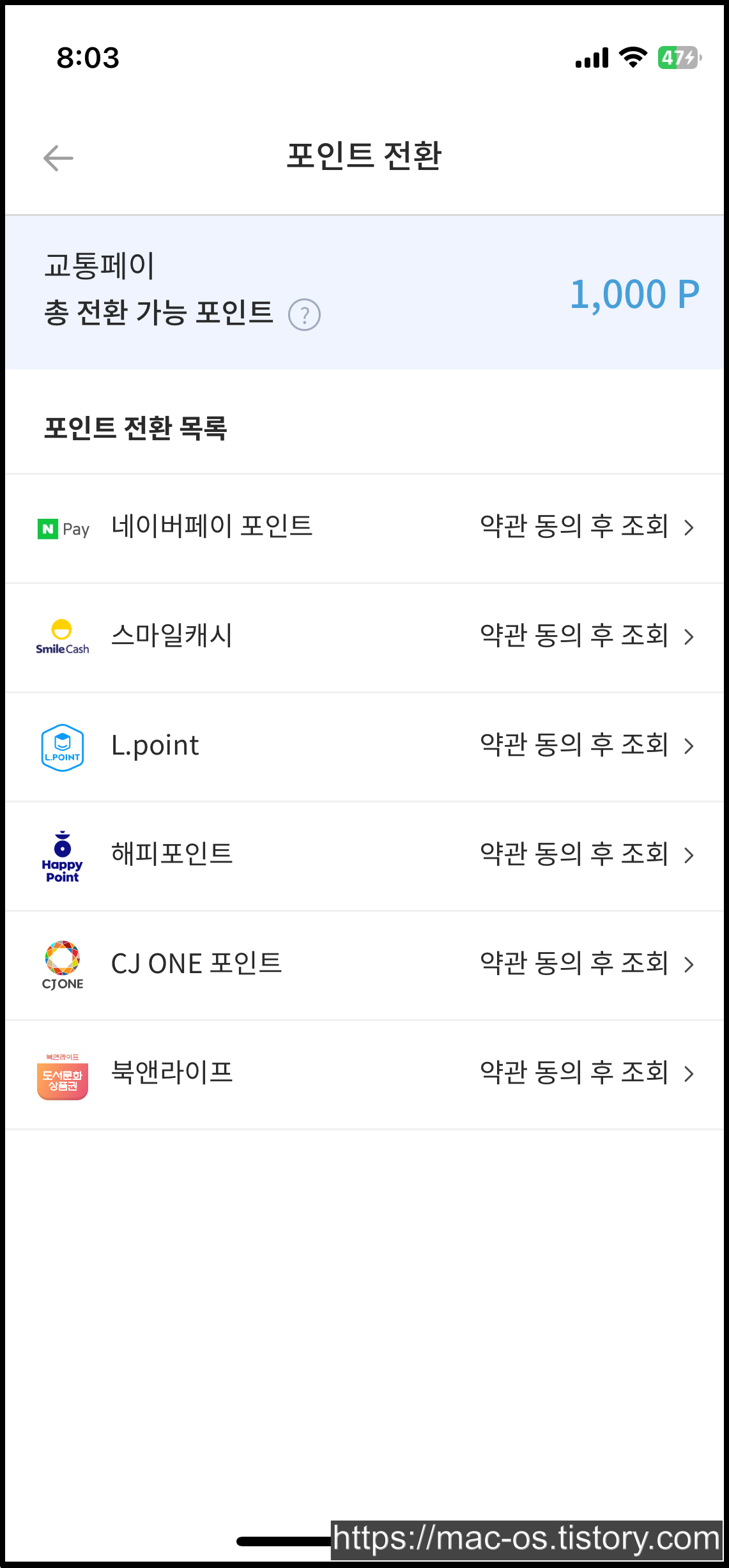 댐댐에서 받은 교통페이 포인트는 [전환]에서 네이버페이 포인트나 스마일캐시, L포인트, 해피포인트 CJ 원포인트, 북앤라이프 포인트로 교환할 수 있어요.