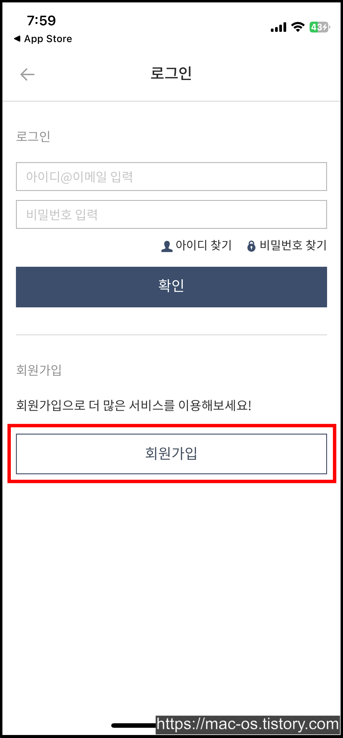 홈 화면에서 [로그인]을 누르고 [회원가입]을 진행해주세요.