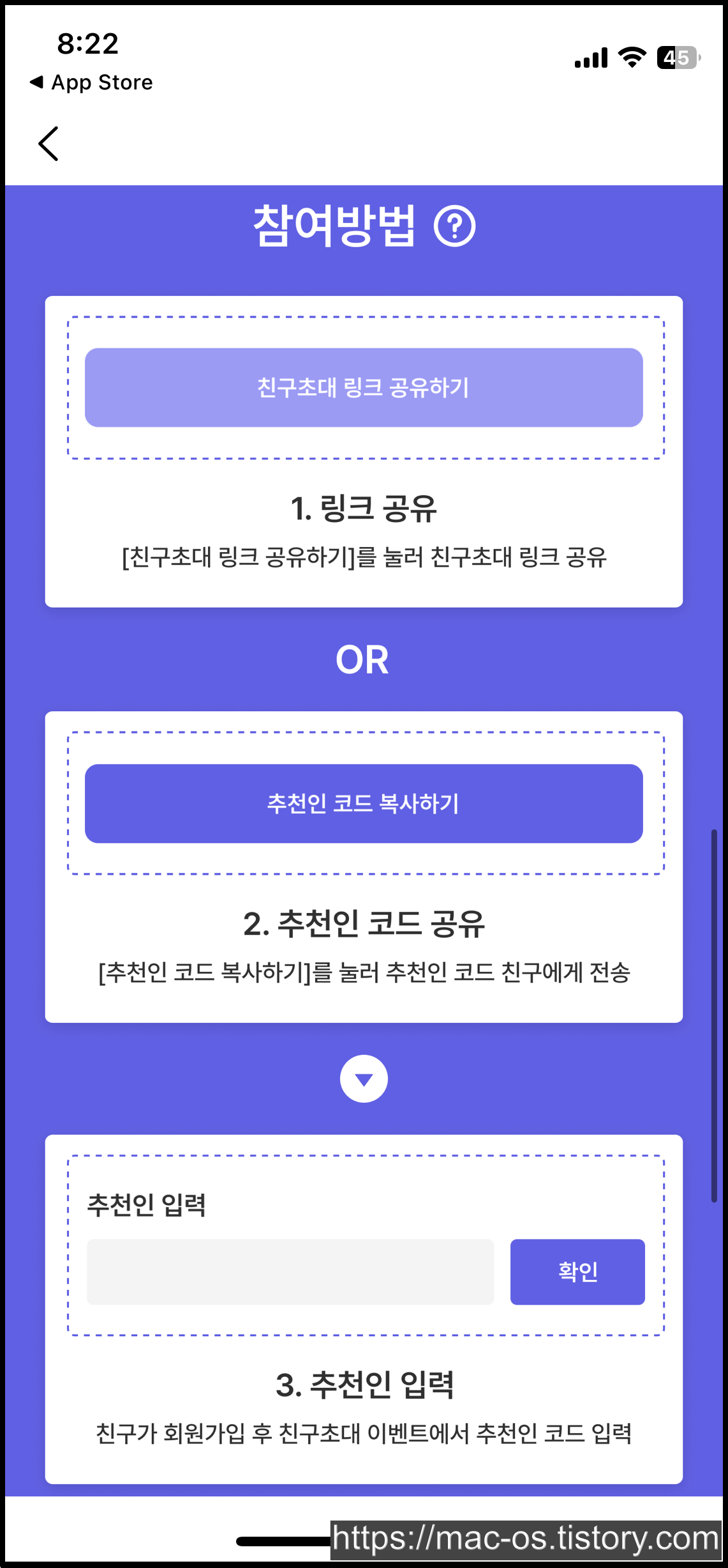 이벤트 페이지에서 스크롤을 아래로 내리면 추천인을 입력하는 칸이 있다. 여기에 대소문자를 구별하여 추천인 코드를 입력하면 된다.