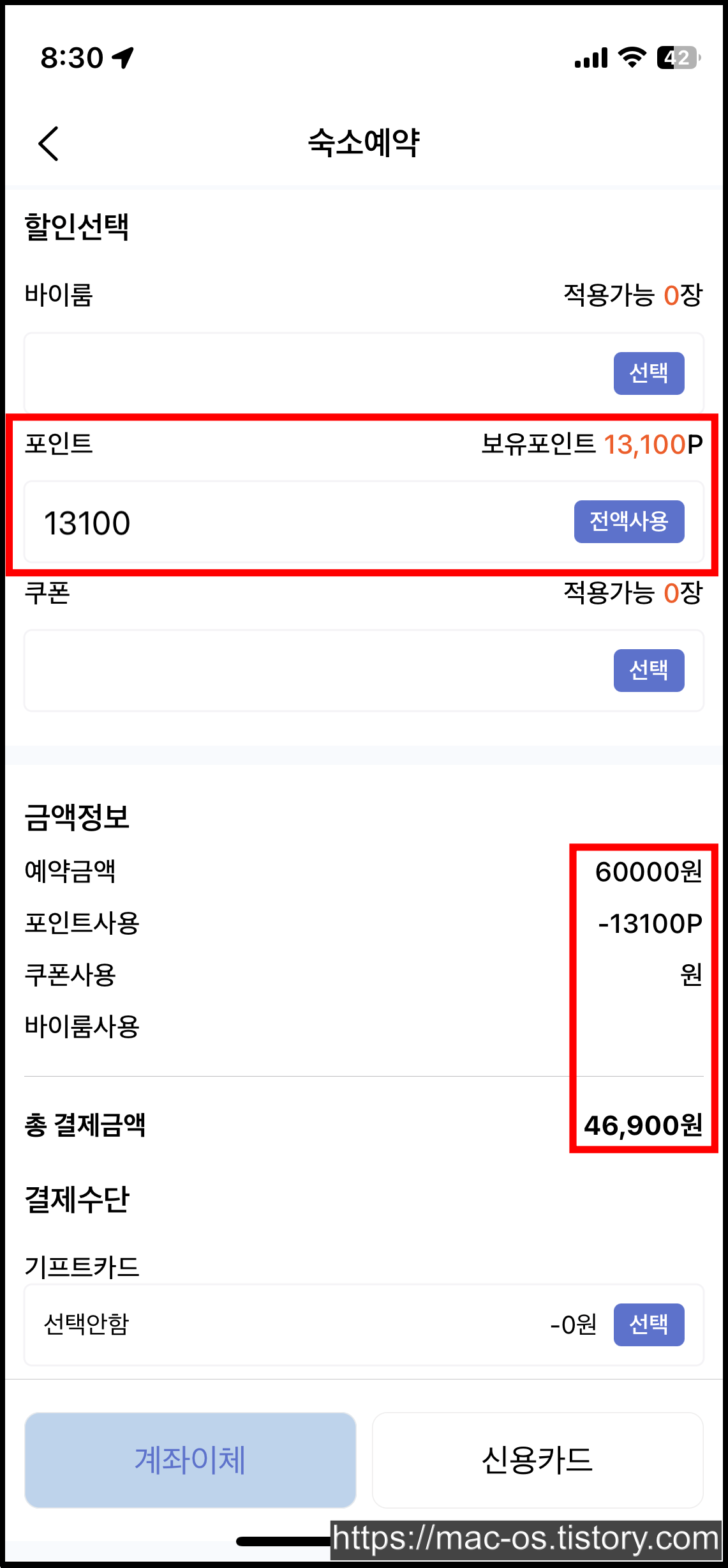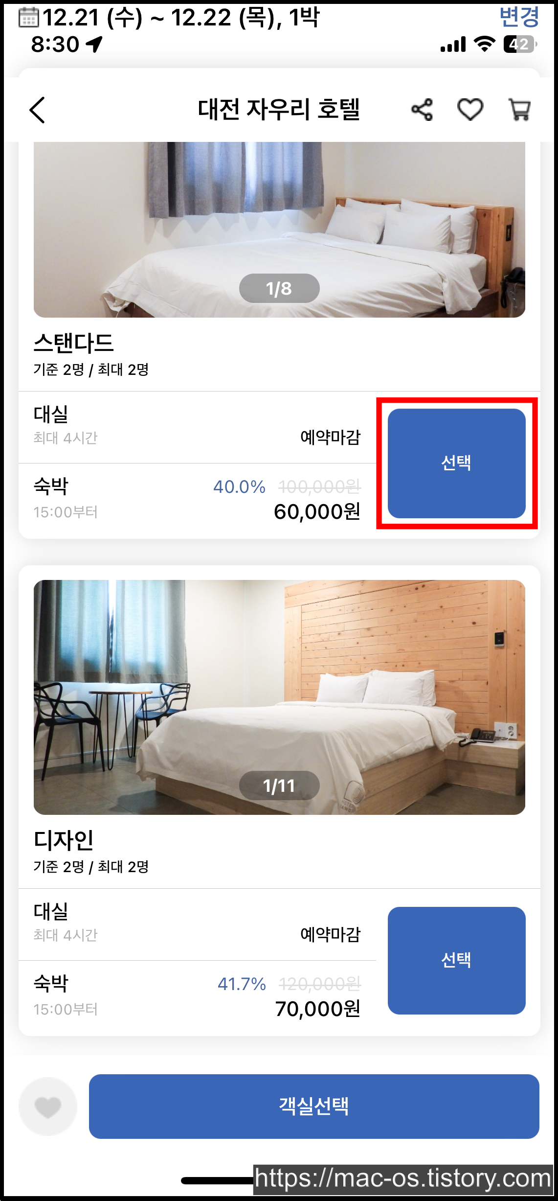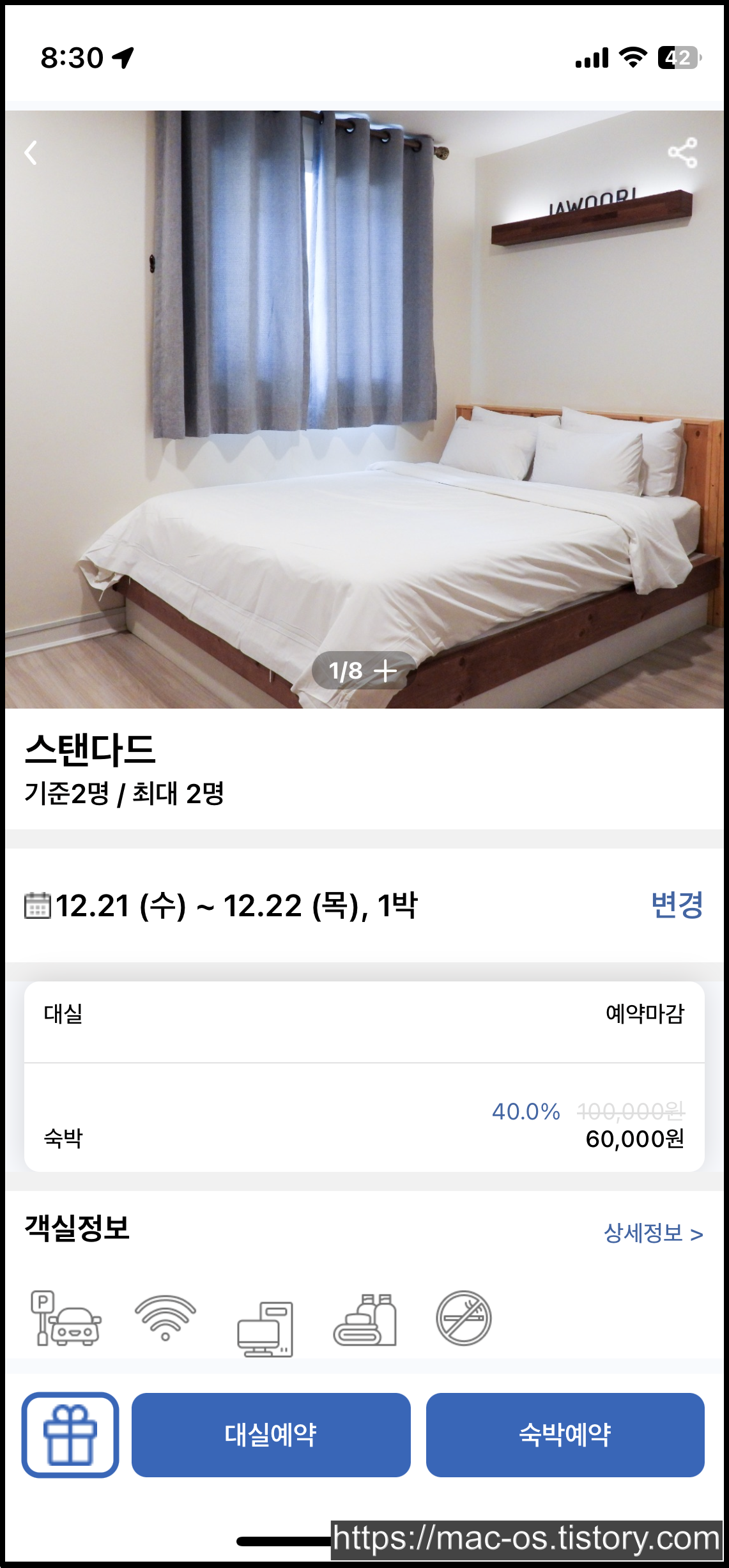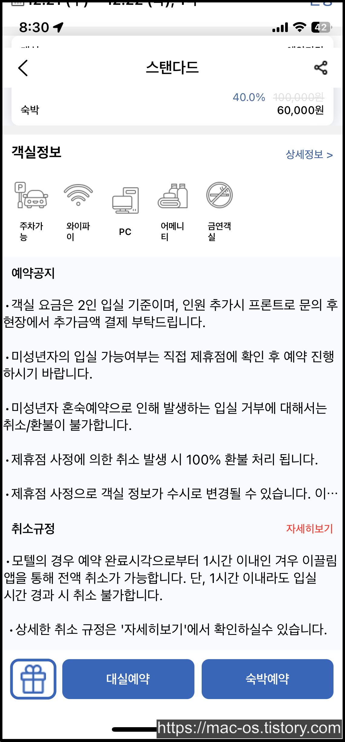 사진에는 6만원 상당의 객실 결제 페이지로 이동해봤는데, 1만 5천원이나 3만원같은 저렴한 숙소도 있으니 참고하길 바란다.