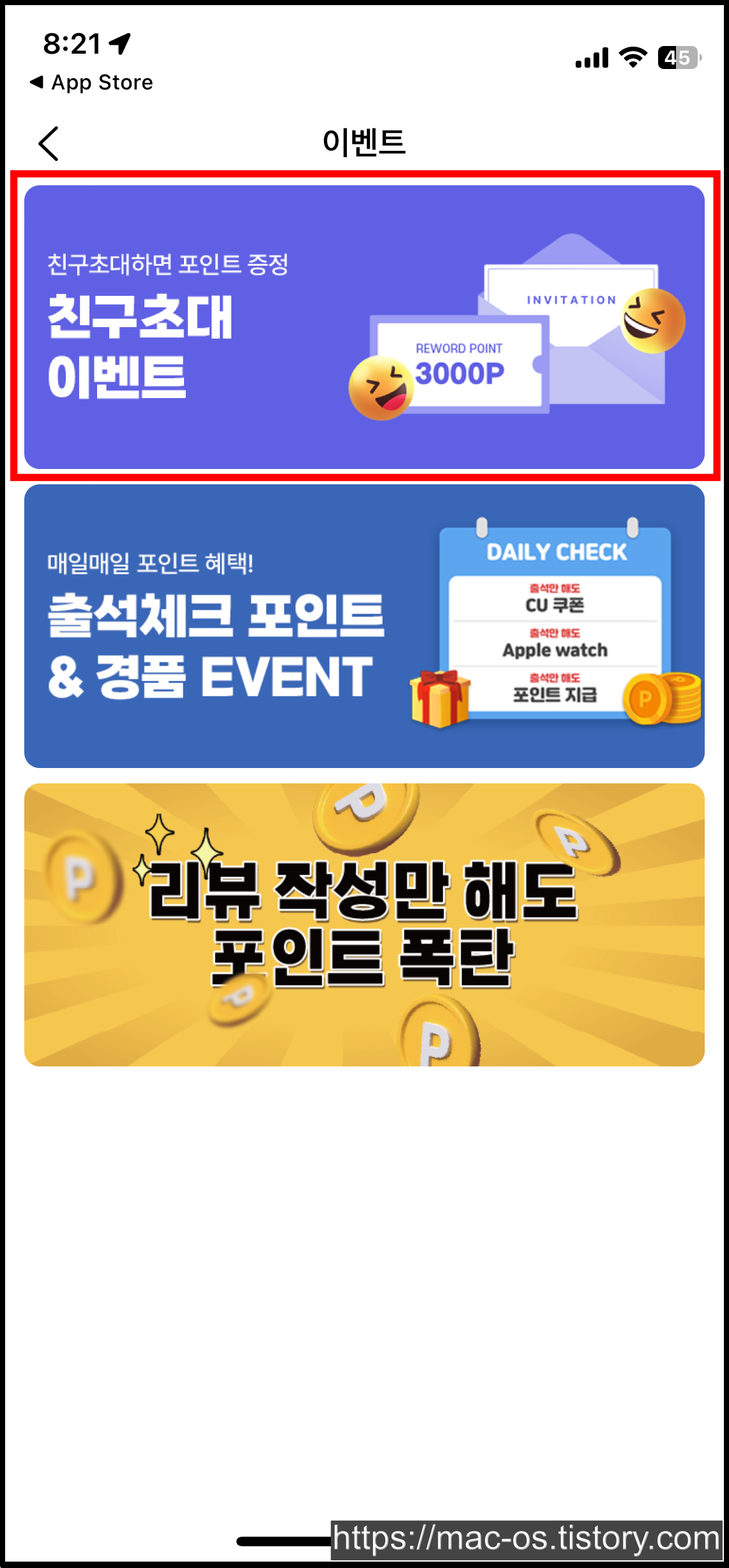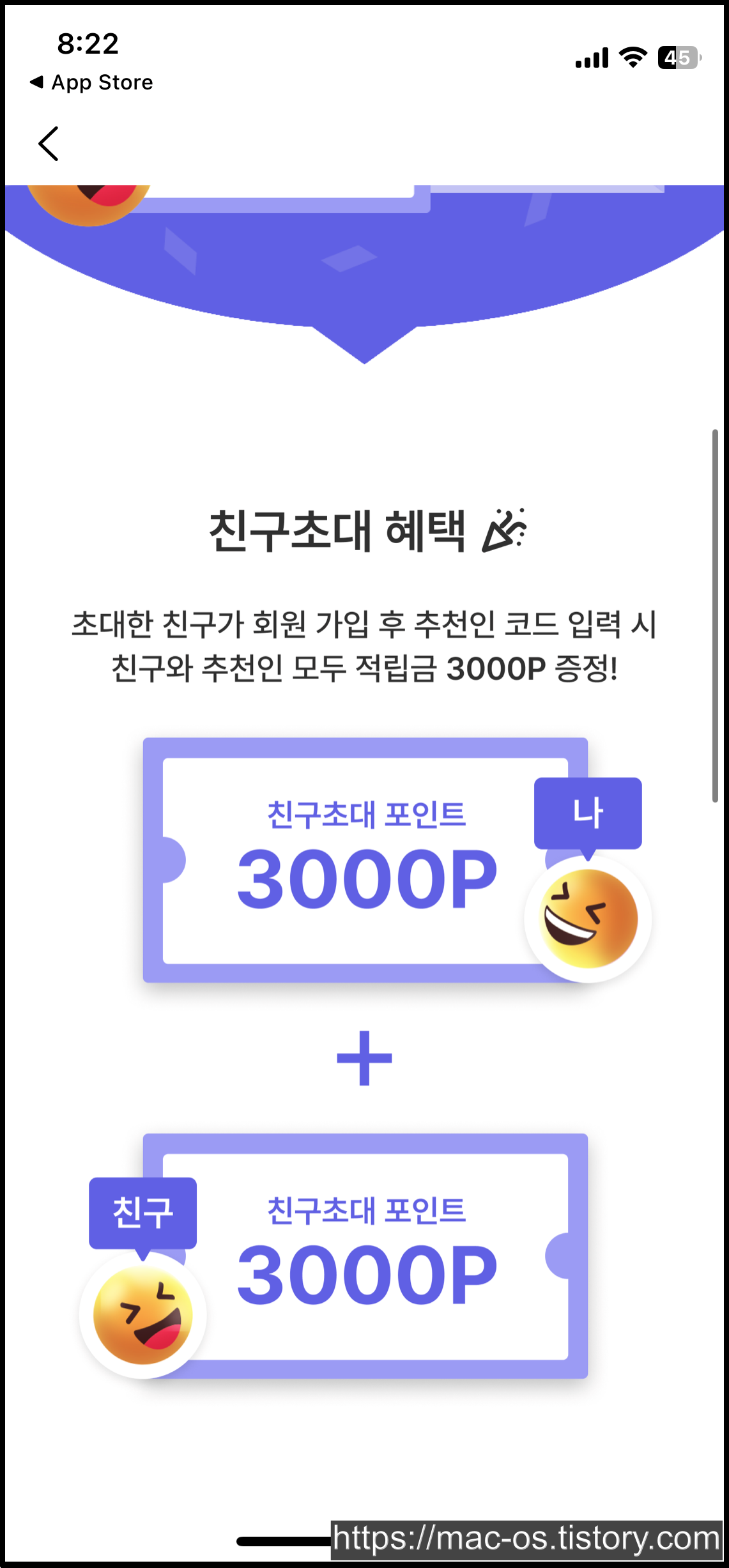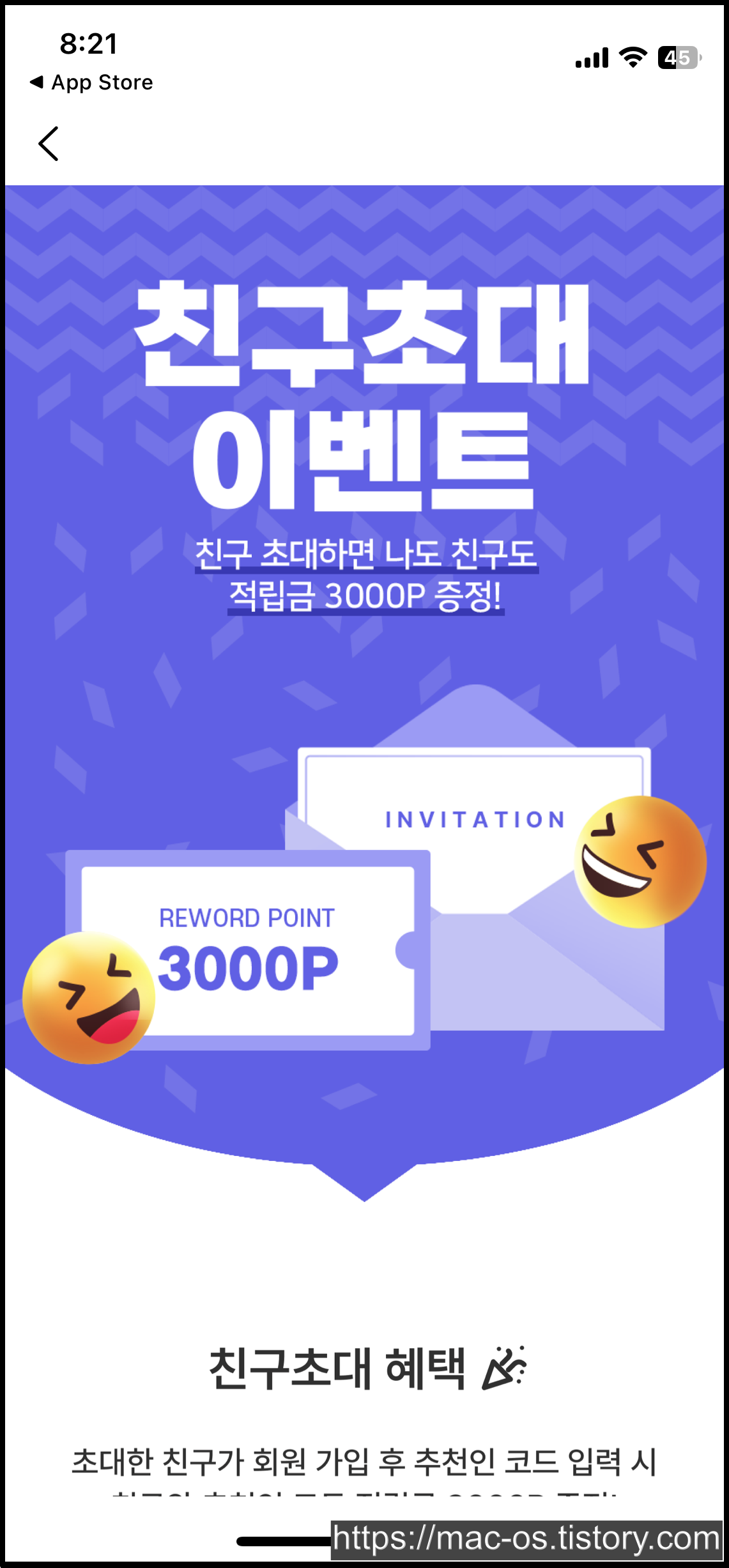 회원가입 후 [더보기] > [이벤트] > [친구초대 이벤트]로 이동하면 추천인 코드를 입력하고 3,000포인트를 추가로 더 받을 수도 있다.