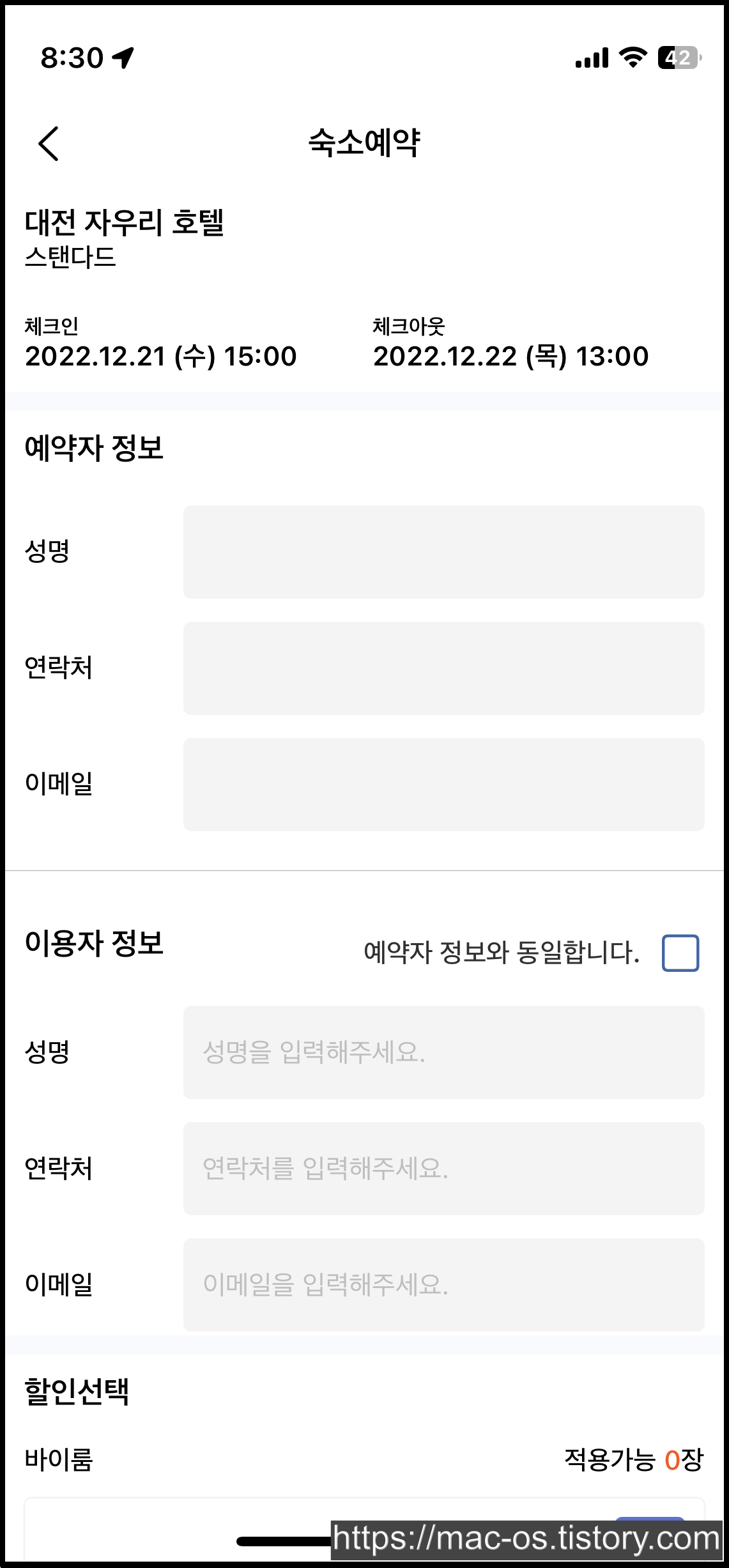 결제 페이지에서는 예약자 정보와 이용자 정보, 할인 선택을 할 수 있었다. 할인 선택에서 가지고 있는 포인트를 전액사용이 가능한 것처럼 보였는데, 만약 이것으로 0원 결제가 된다면 상당히 매력적인 앱이라고 생각한다.