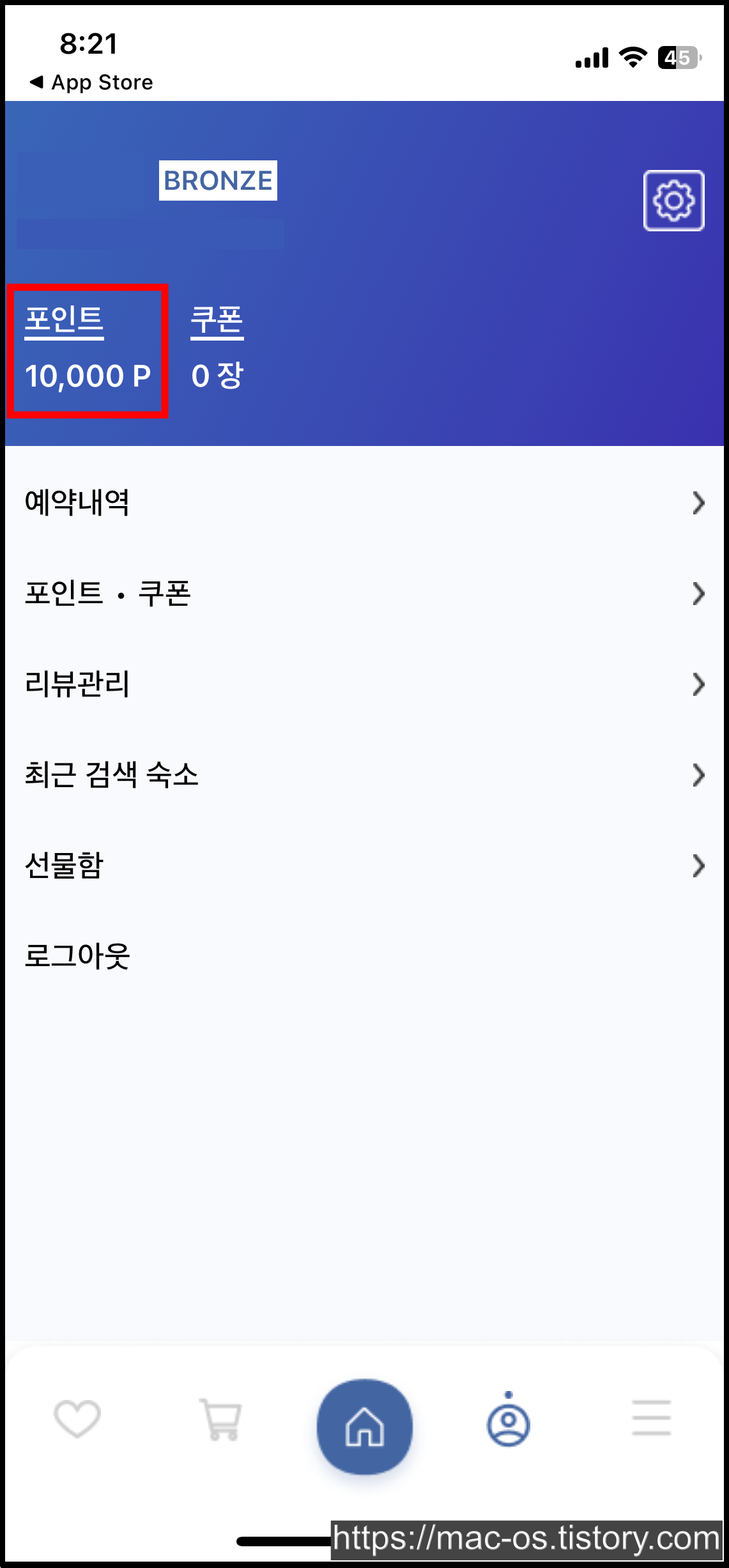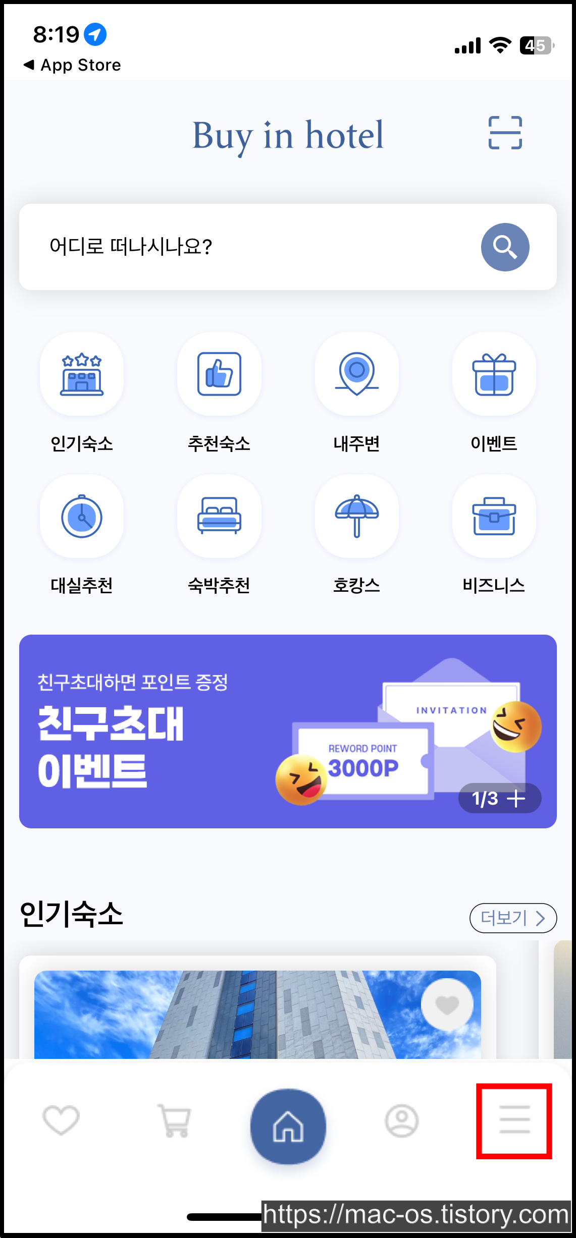 구글 플레이 스토어에선 바이인호텔, 애플 앱스토어에선 BuyinHotel이라는 이름으로 앱이 출시되어 있다. 앱을 설치한 다음 우측 하단의 더보기 탭을 터치한다.