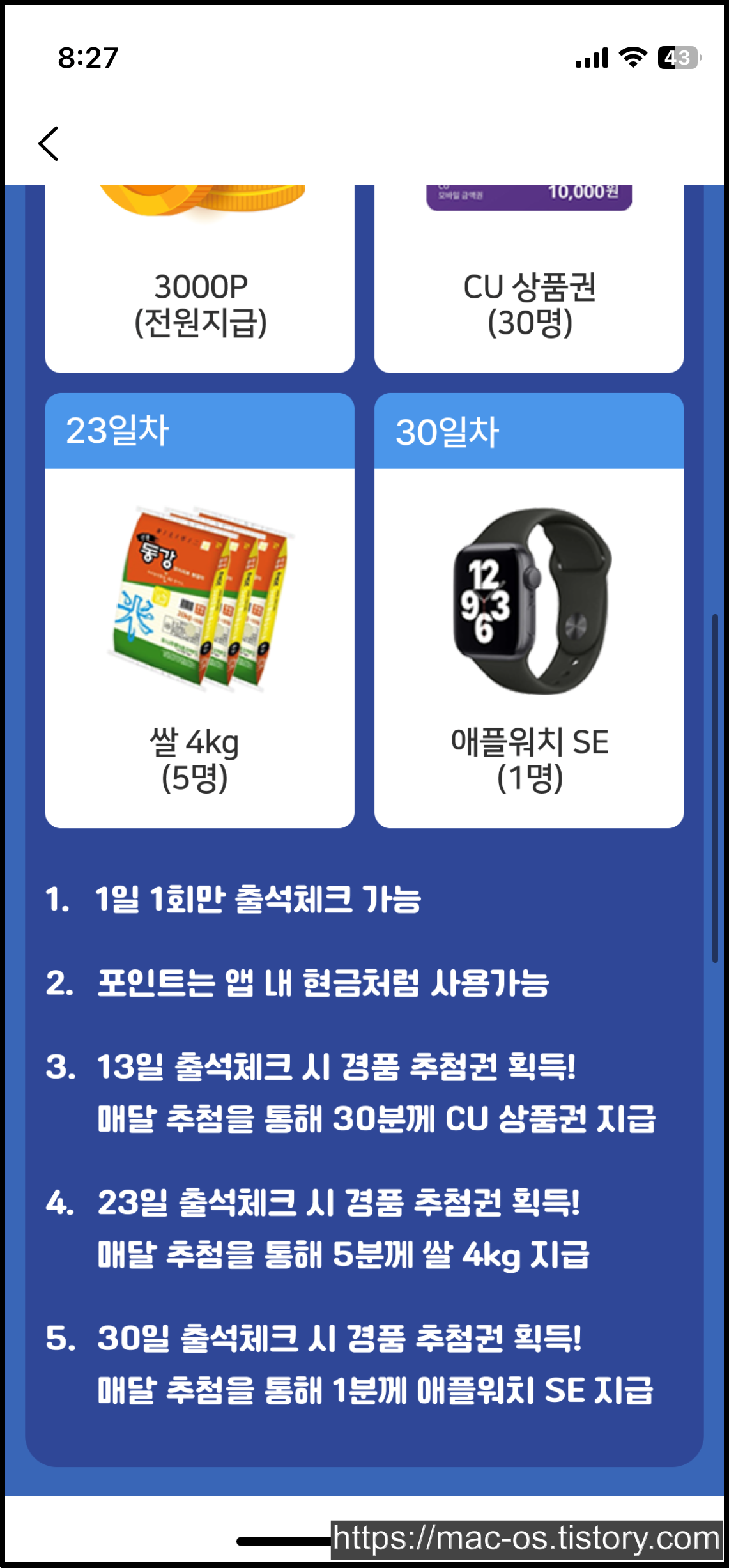 23일과 30일에 출석을 완료하면 각각 5명, 1명에게 쌀 4KG와 애플워치 SE를 지급한다.