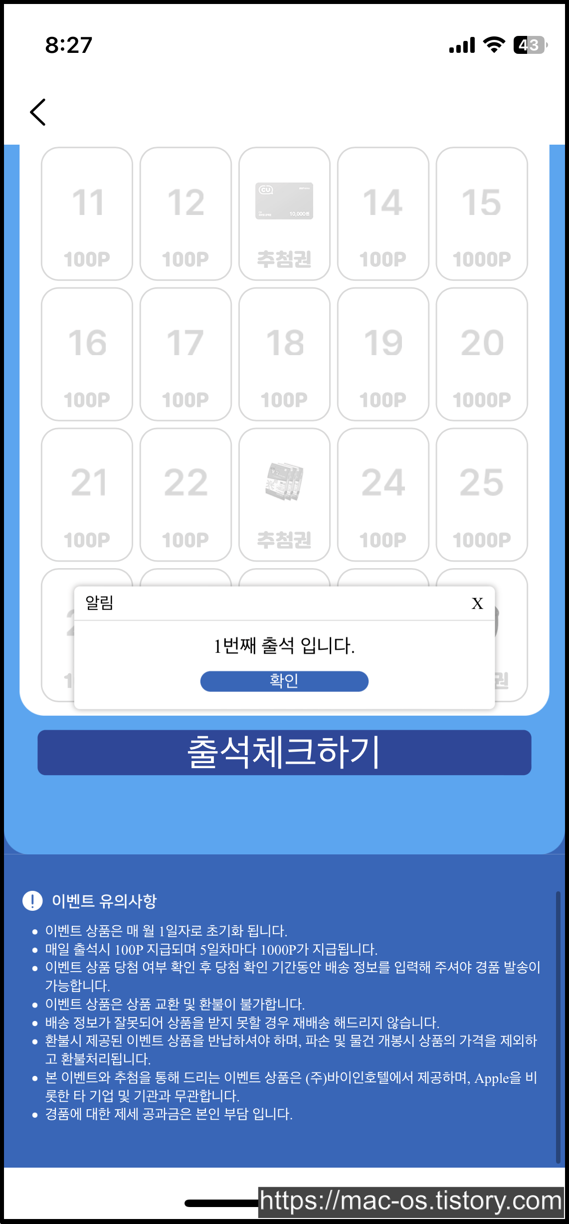 출석체크를 마치면 출석판에 기재된 포인트만큼 적립된다.
