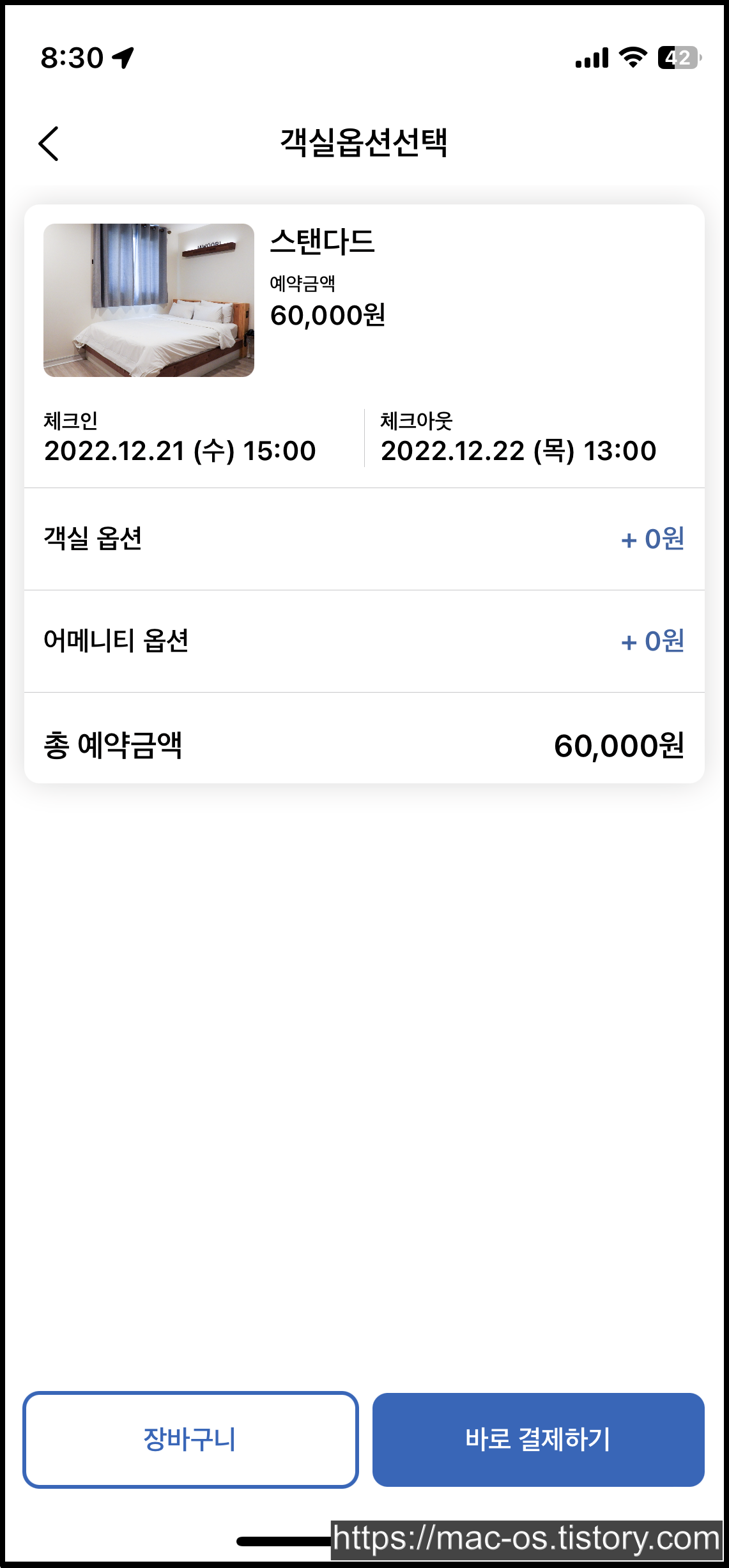 객실정보에서 예약공지와 안내사항이 적혀있다. 장바구니에 담을 수 있고 바로 결제할 수도 있다.