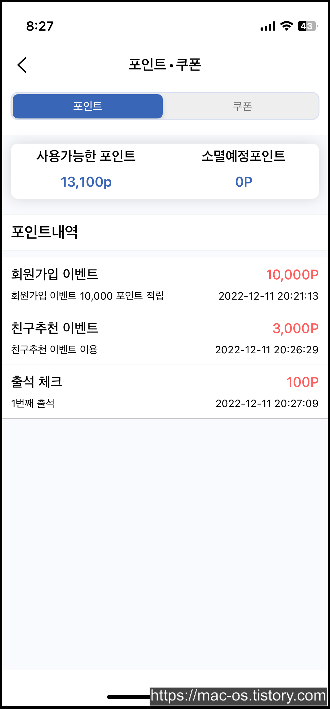 회원가입 이벤트와 마찬가지로 친구추천 이벤트로 3,000포인트가 추가 적립된 것을 확인할 수 있다.