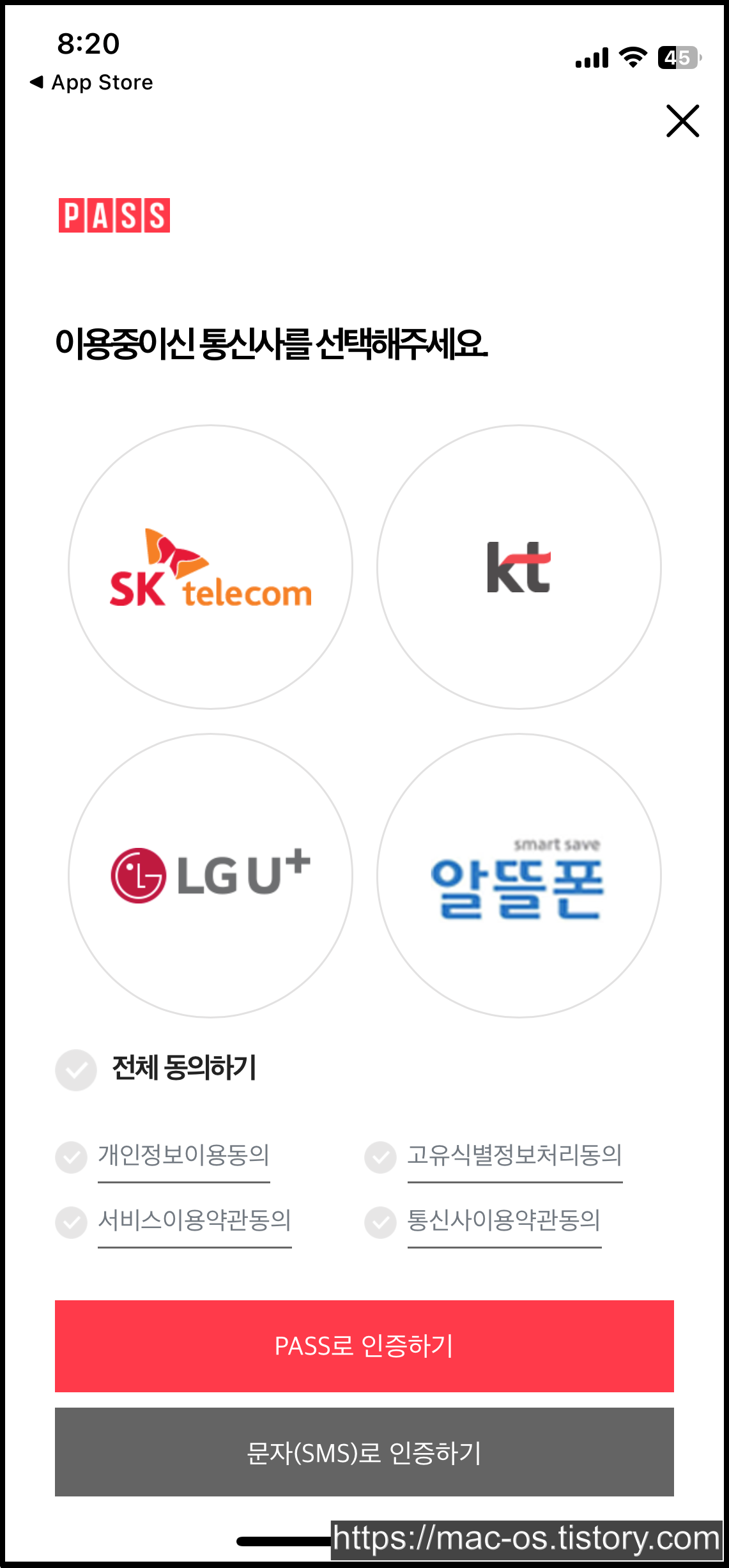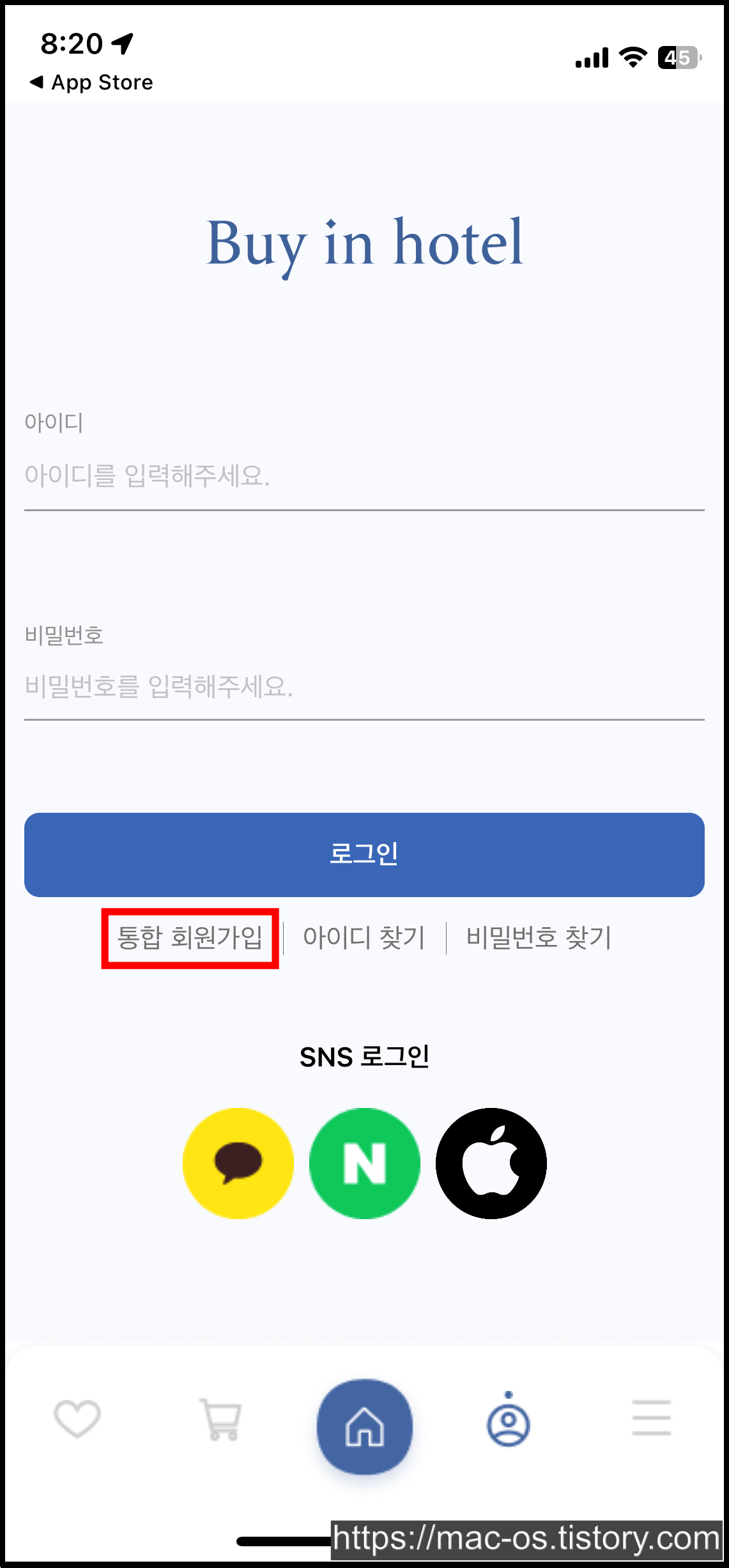 바이인호텔은 카카오, 네이버, 애플 계정 또는 통합 회원가입을 통해 로그인할 수 있다. 통합 회원가입을 선택한 경우 휴대폰 인증을 진행해야 한다.