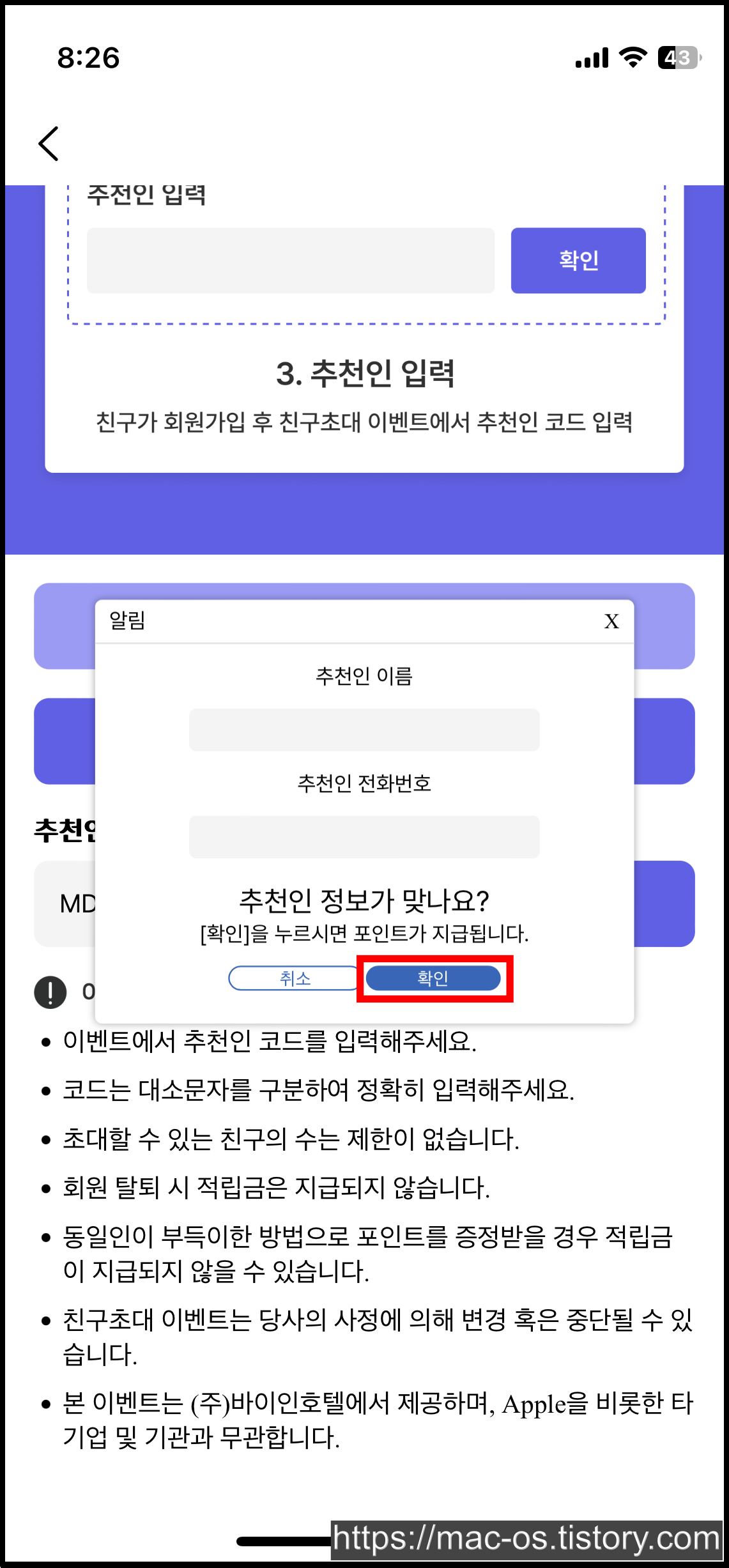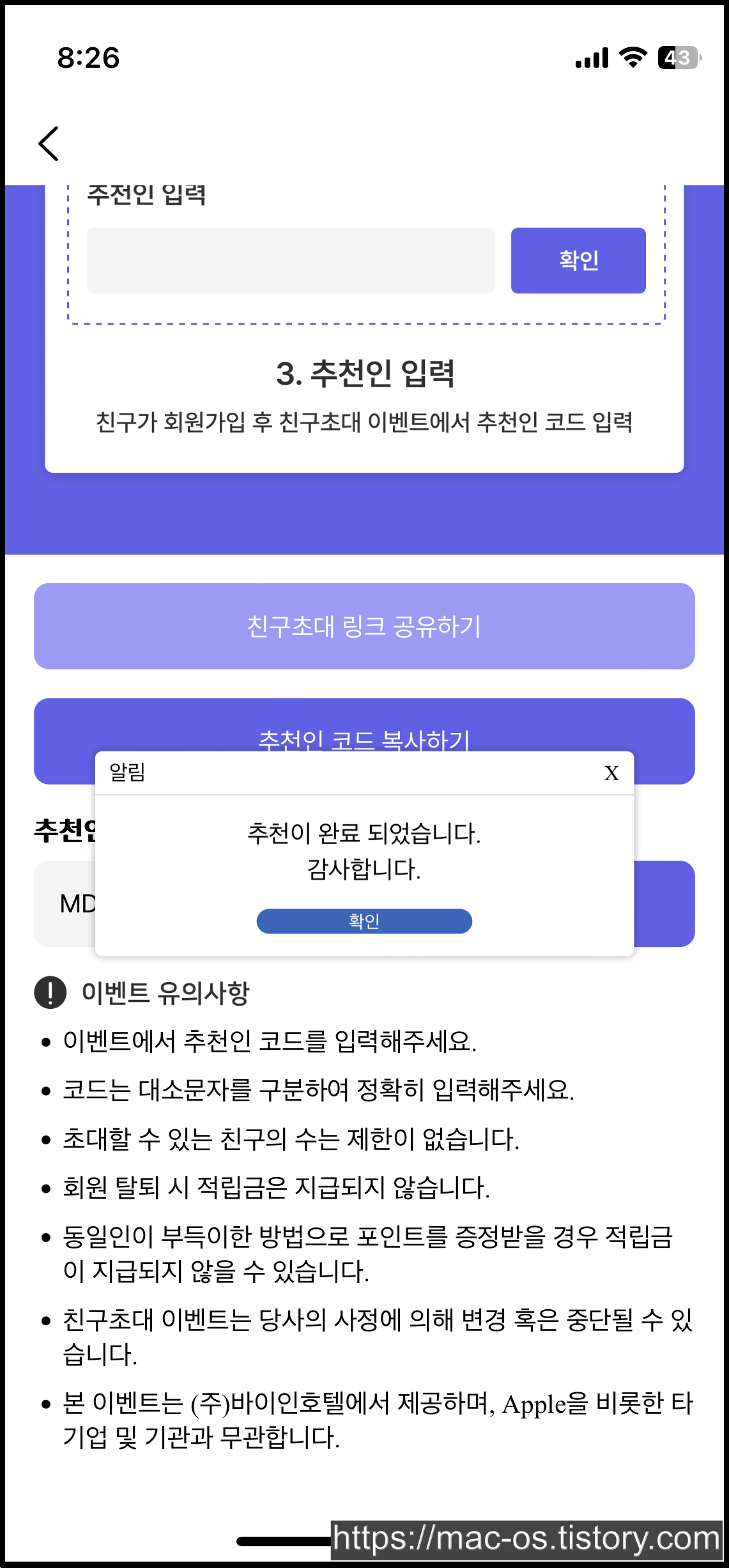 확인 버튼을 누르면 왼쪽 사진처럼 추천인의 이름과 전화번호가 일부 나타나는데, 확인을 한 번 더 누르면 추천이 완료된다.