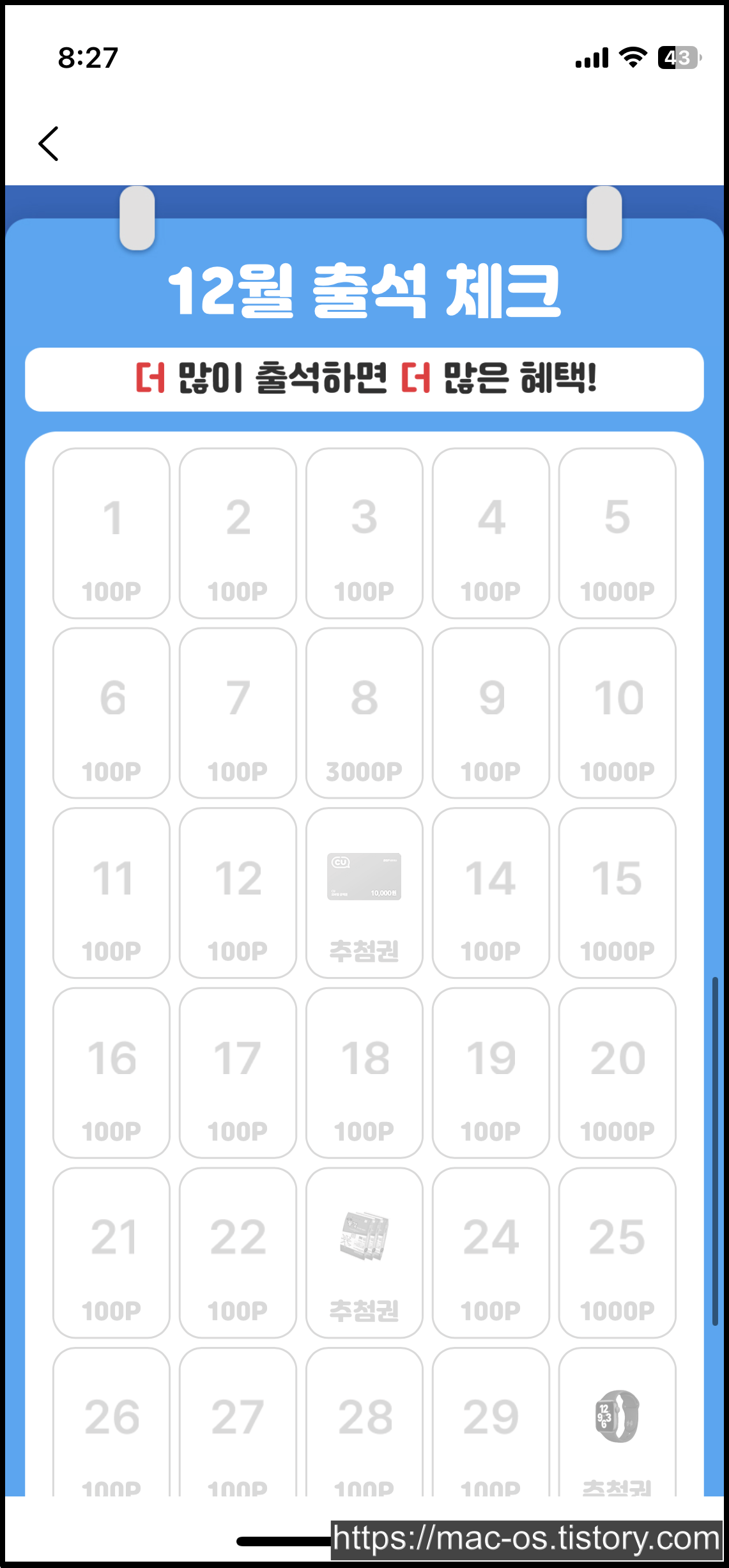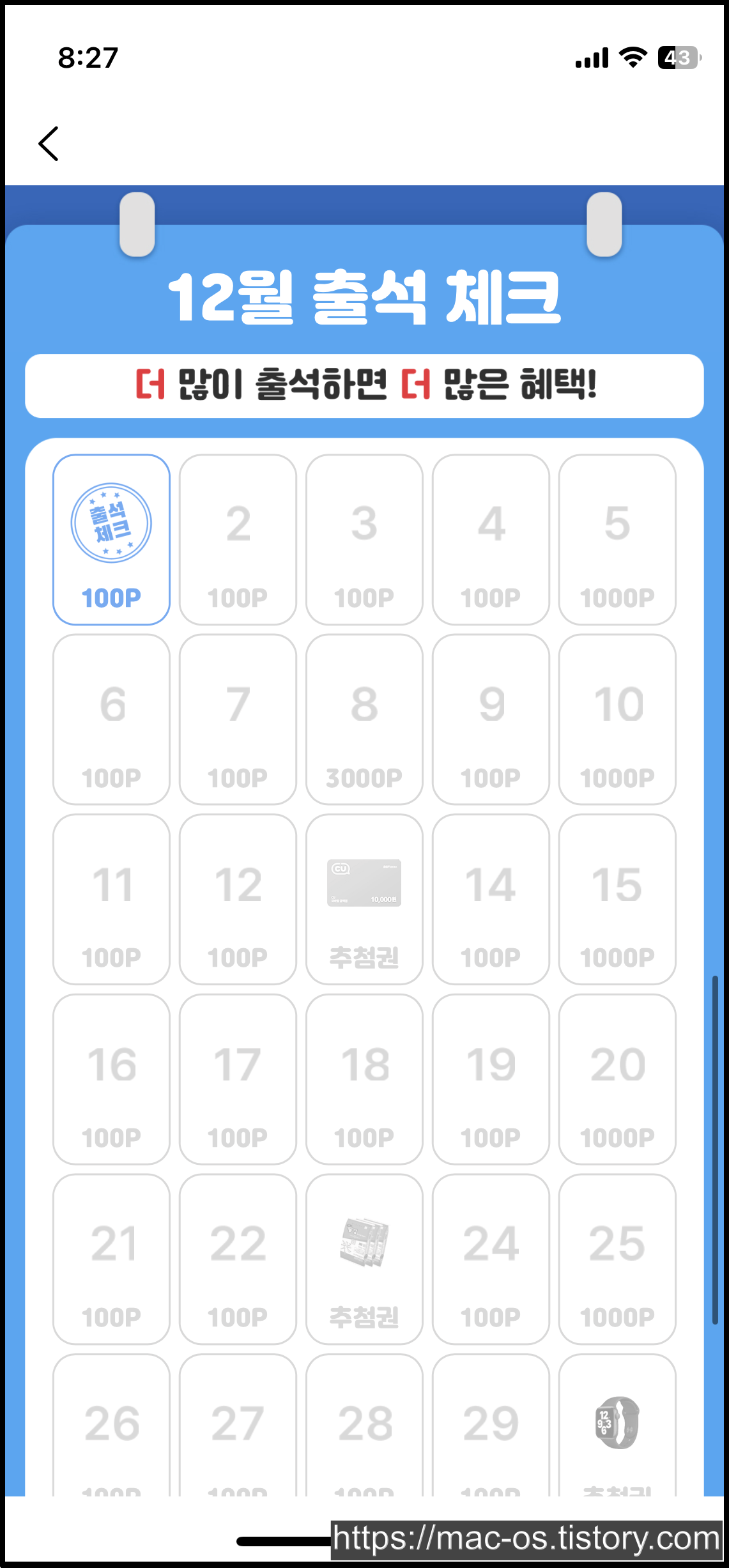 하단의 출석체크하기 버튼을 누르면 출석이 완료된다. 12월 11일에 처음으로 출석한 경우 11번째에 출석이 되는 것이 아니라, 출석횟수에 따라 측정되는 듯하다.