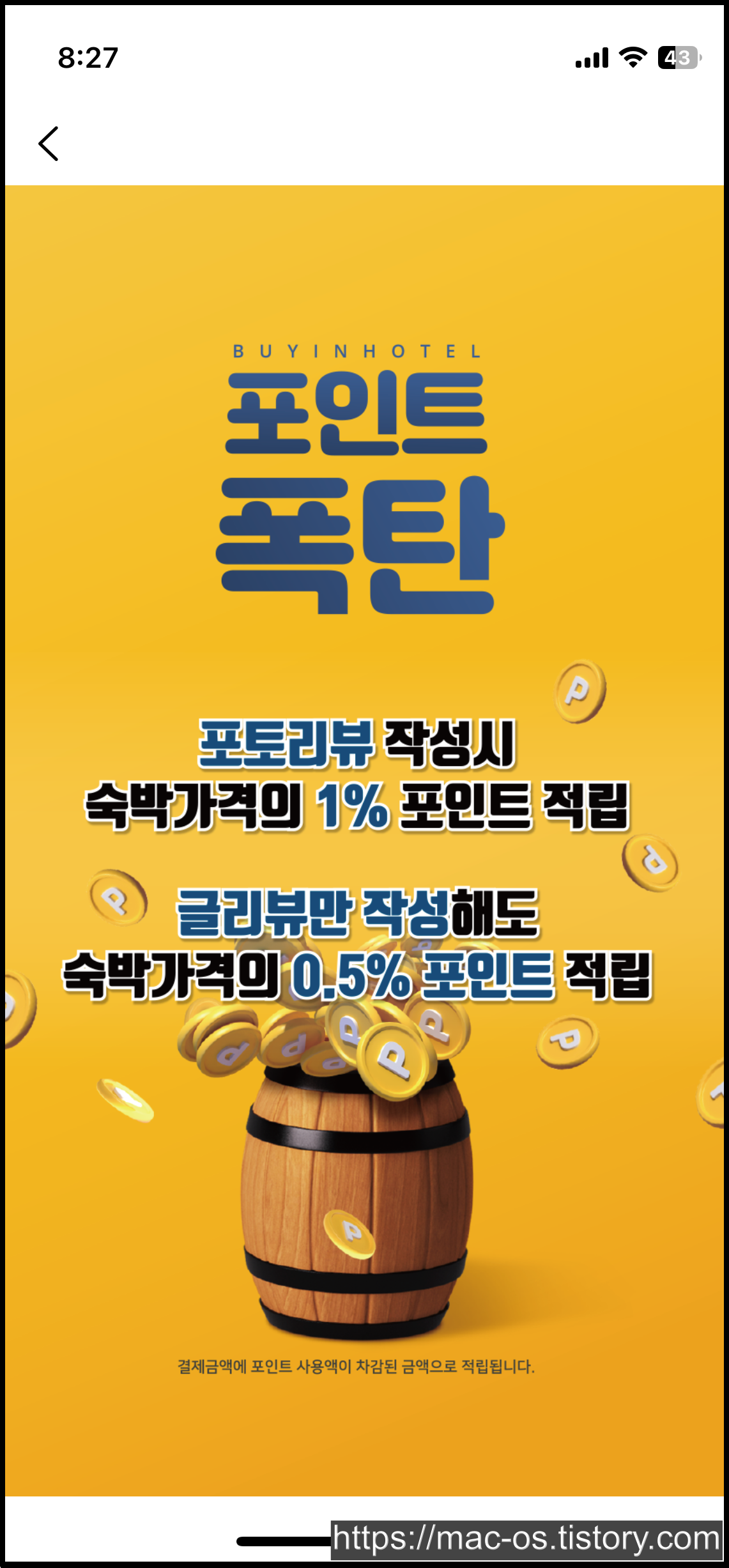 바이인호텔의 마지막 이벤트이다. 바이인호텔에서 호텔 또는 모텔에 예약하고 포토리뷰를 작성하면 숙박가격의 1%, 글리뷰를 작성하면 0.5% 포인트를 적립받을 수 있다.
