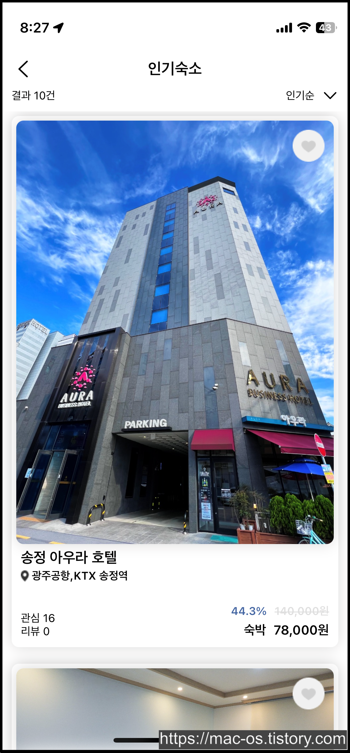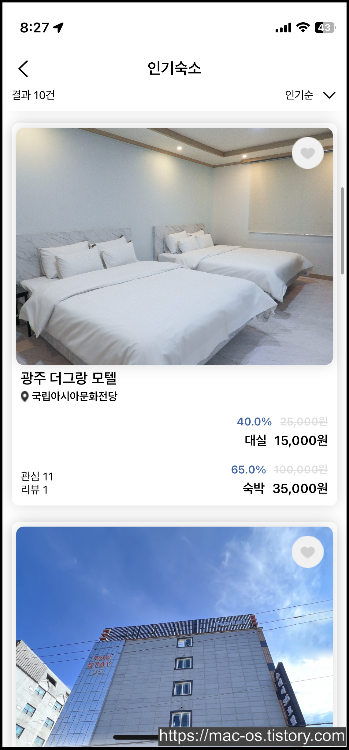 바이인호텔의 앱 홈 화면에서 인기숙소를 눌러봤는데 광주 지역의 호텔이나 모텔이 많았다.