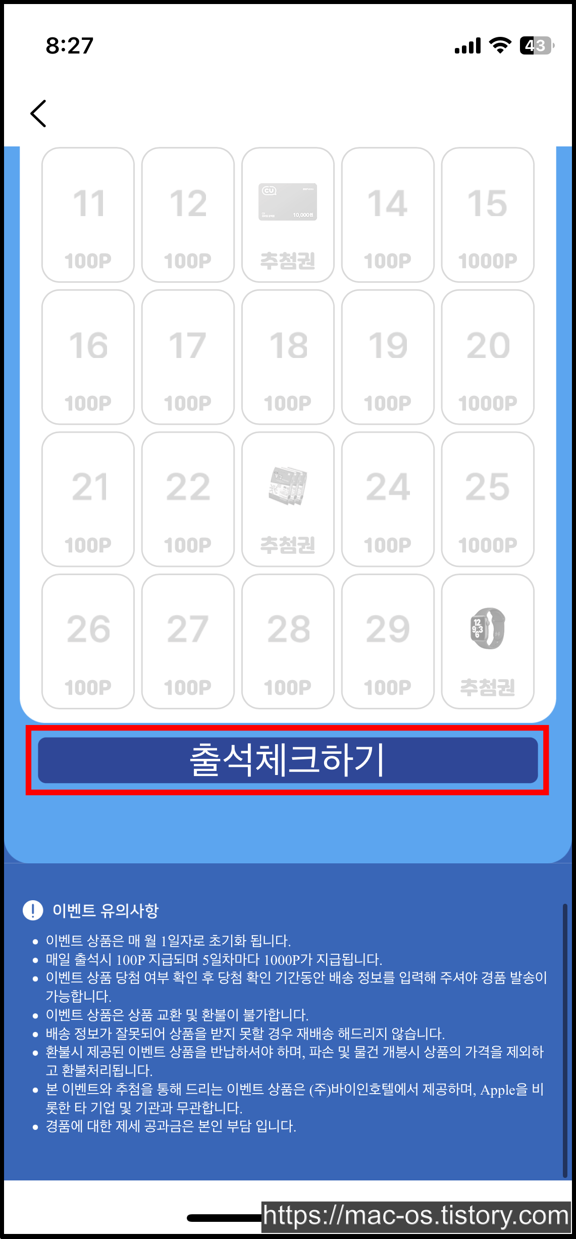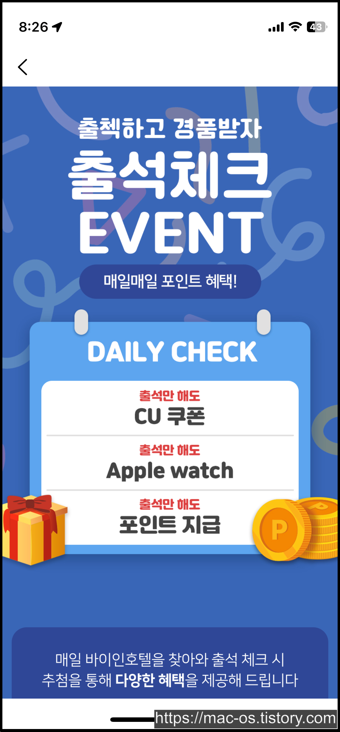 바이인호텔에서는 매일 출석체크하는 것만으로도 한달에 10,100포인트와 경품 추첨권을 받을 수 있다. 경품은 CU 상품권 1만원과 쌀 4KG, 애플워치 SE이다.