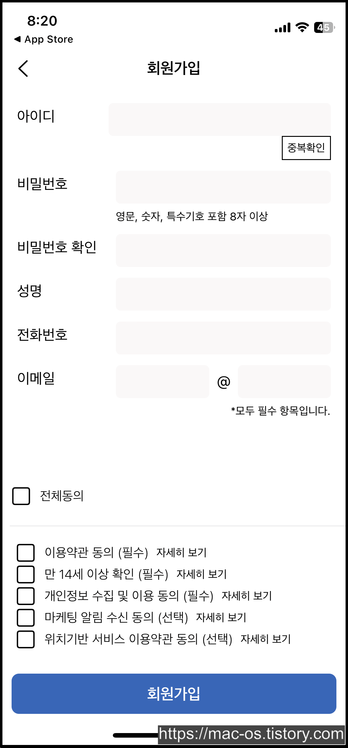 휴대폰 본인인증을 마치고 아이디와 비밀번호, 성명, 전화번호, 이메일을 입력하고 가입을 완료한다.