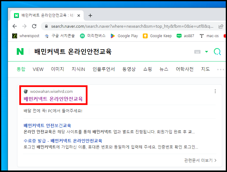 네이버 검색창에서 배민커넥트 온라인안전교육을 입력하고 클릭해줍니다.