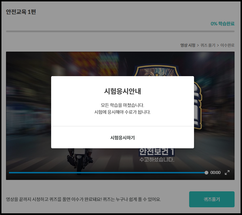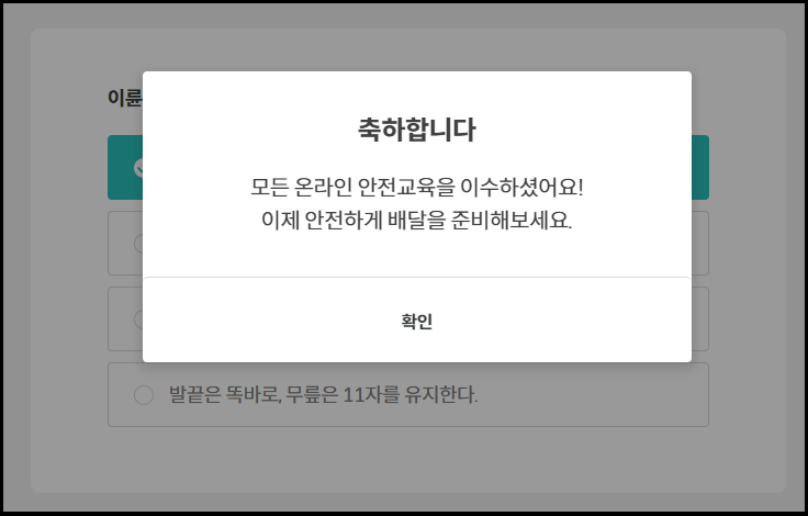 2편도 퀴즈를 다풀면 이렇게 축하한다는 창이 뜨고 안전교육이 끝나게 됩니다.