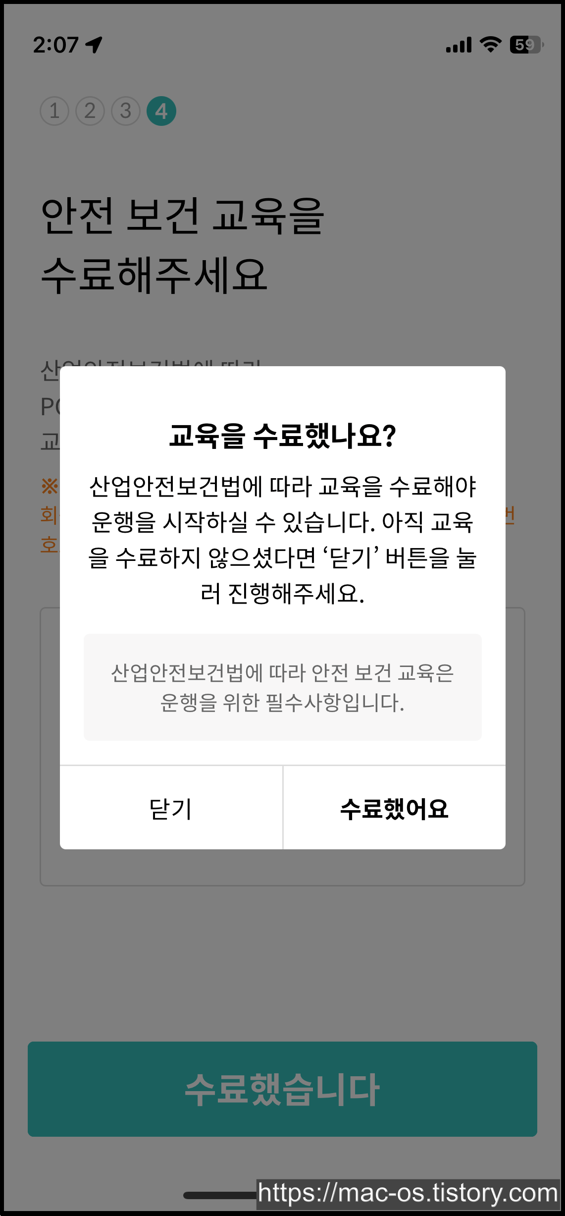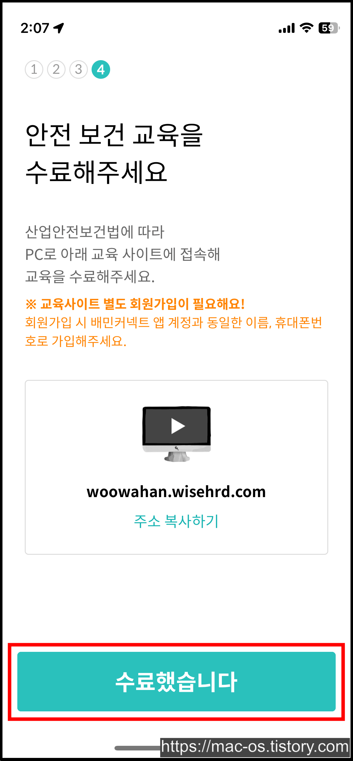 다시 배민커넥트 앱으로 돌아와서 수료했습니다 버튼을 눌러줍니다.