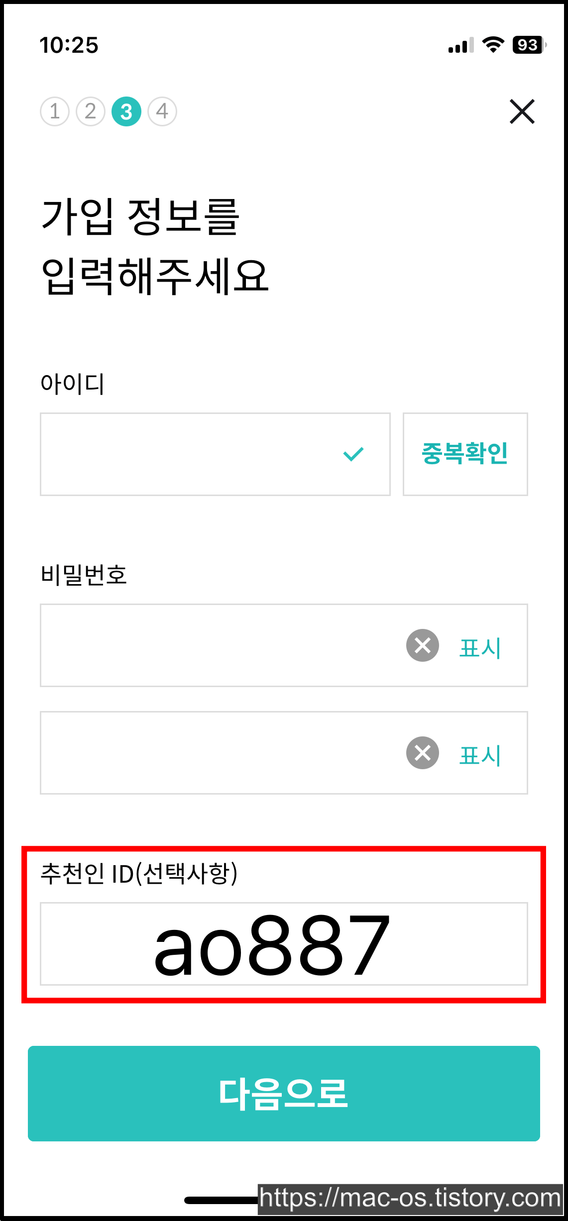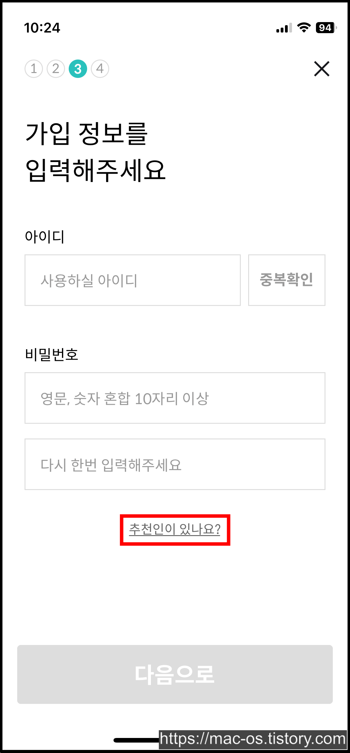 휴대폰 본인인증을 하고 나면 아이디와 비밀번호를 입력하실 수 있는데요. 여기서 '추천인이 있나요?'를 누르면 추천인 아이디를 입력하실 수 있습니다.
