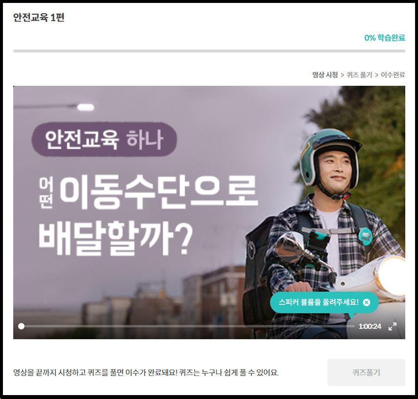 가입 방법도 쉬워서 누구나 도보로 가능한 것 같았구요. 다만 시간이 조금 걸립니다. 회원가입 하고 나서 PC로 안전교육 1시간짜리 2개를 보고 퀴즈를 풀어야 되네요. 퀴즈는 구글에 쳐보면 정답 다 나오구요.