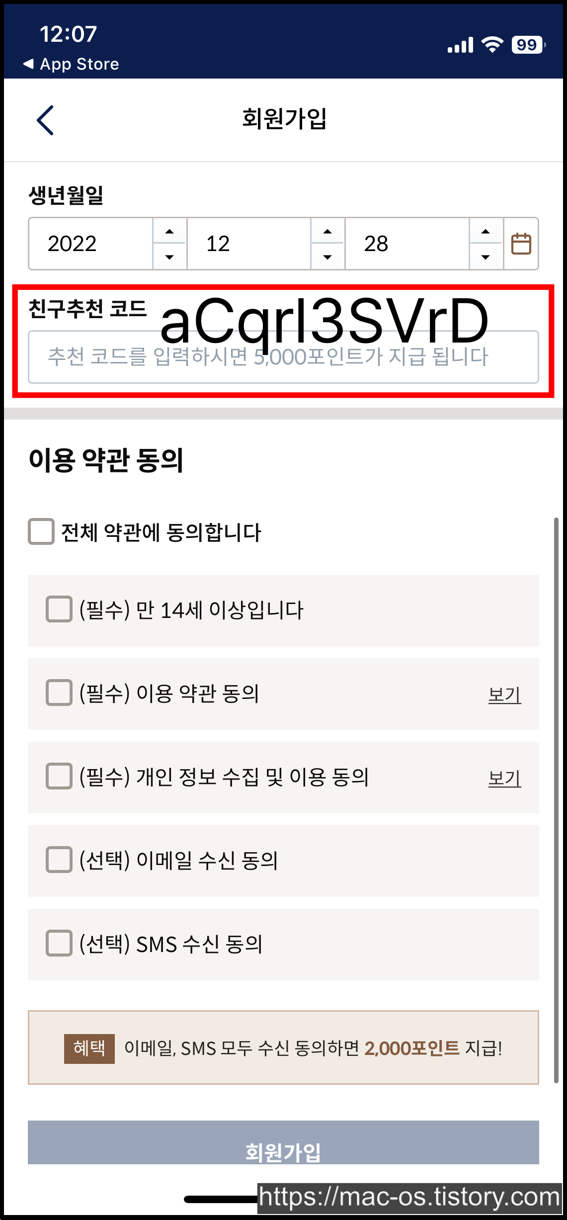 회원가입 페이지에서 친구추천 코드를 입력할 수 있다. aCqrl3SVrD를 복사해서 붙여넣고 이메일과 SMS를 모두 수신 동의하고 가입한다.