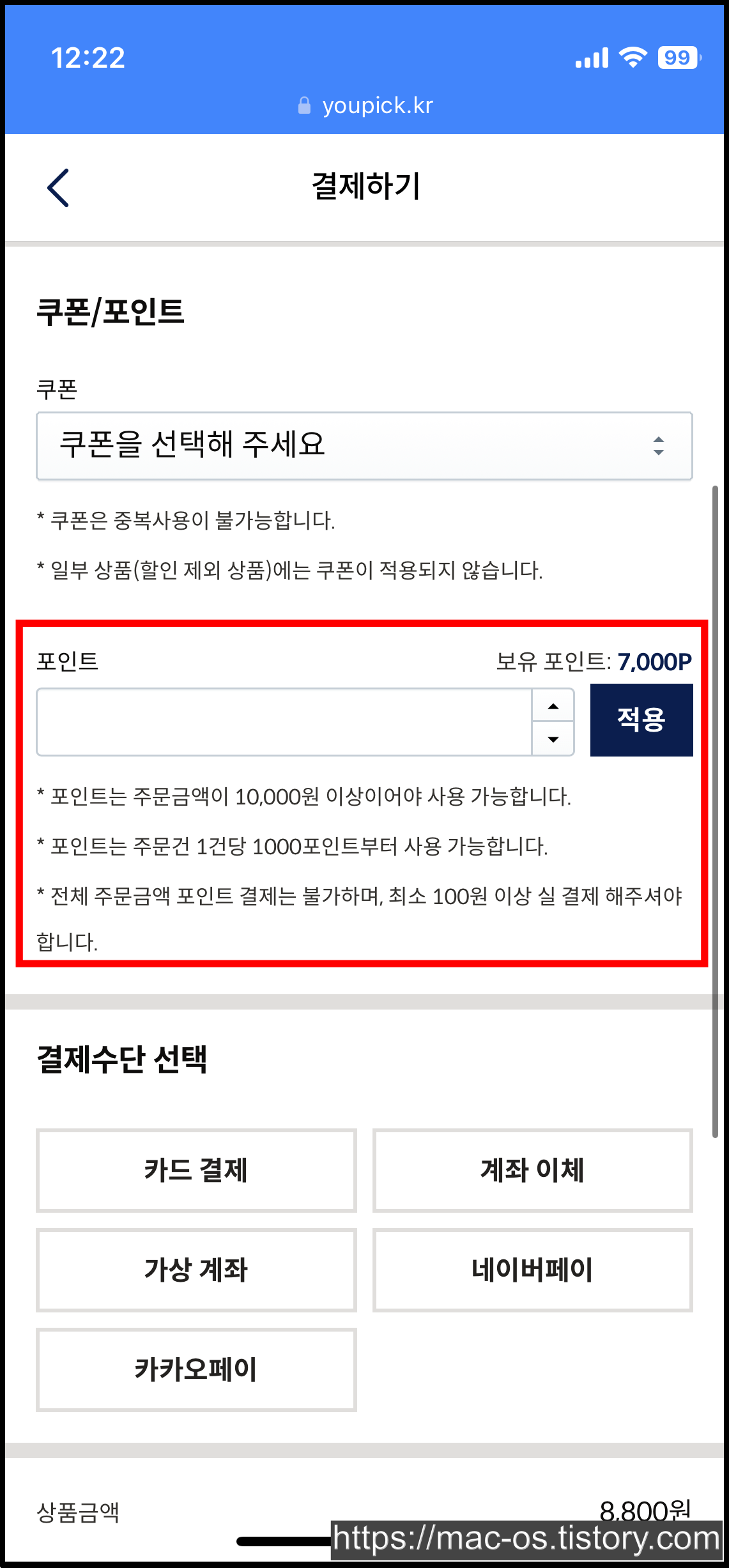 가입하면서 받은 7,000포인트는 어떻게 사용할 수 있는지 결제 페이지로 이동해봤다.