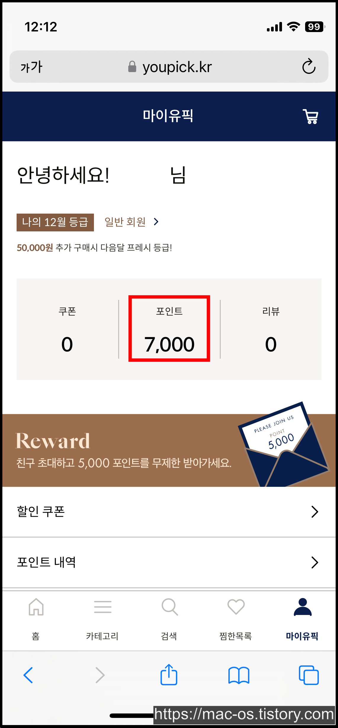 가입을 마치면 7,000포인트가 들어온 것을 확인할 수 있다.